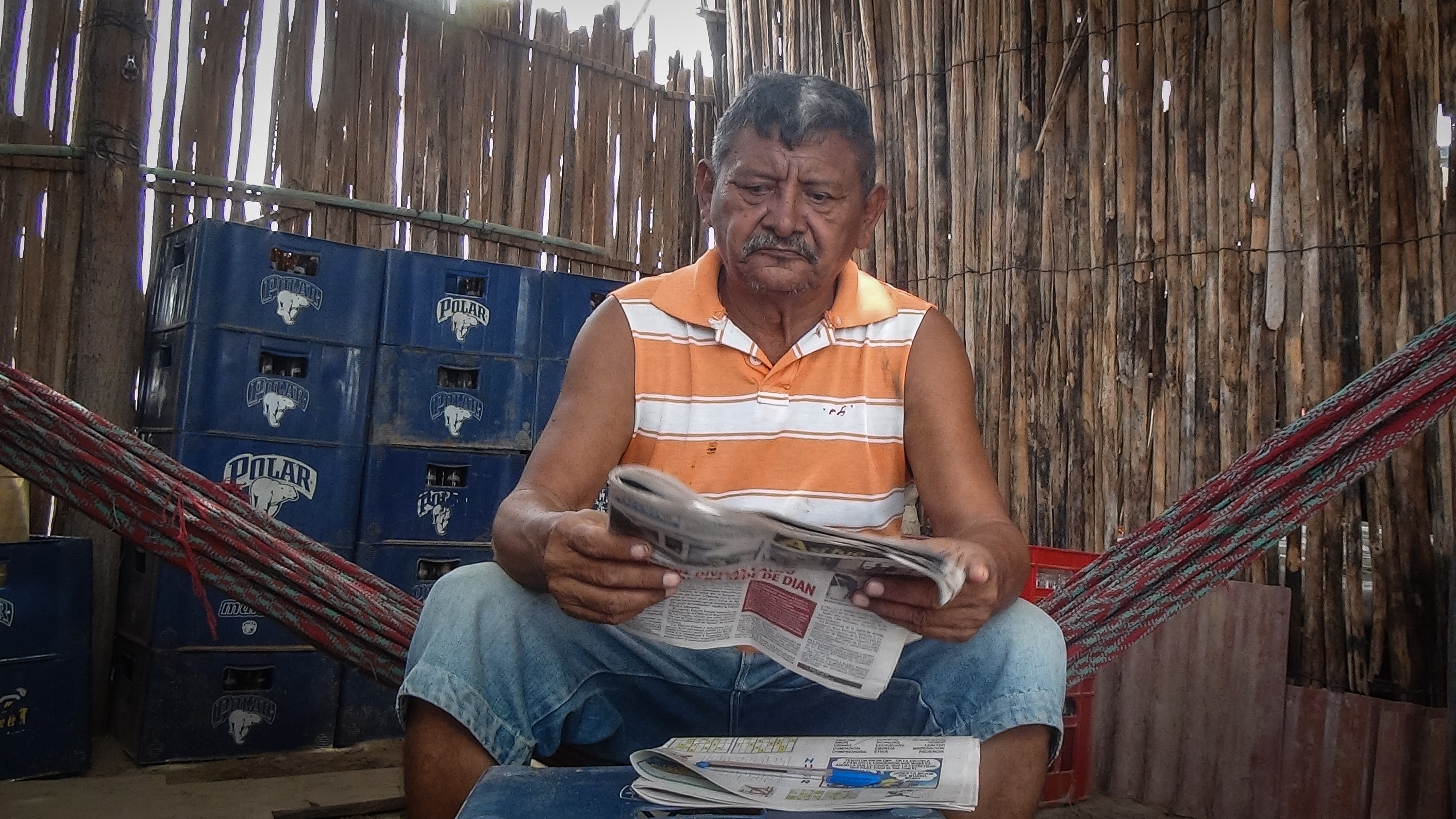 Ricardo Ibarra, indígena wayuu lee el periódico en Uribia, Colombia, para enterarse de lo que pasa en Venezuela, país donde vivió durante 40 años. (Foto. Edilma Prada)