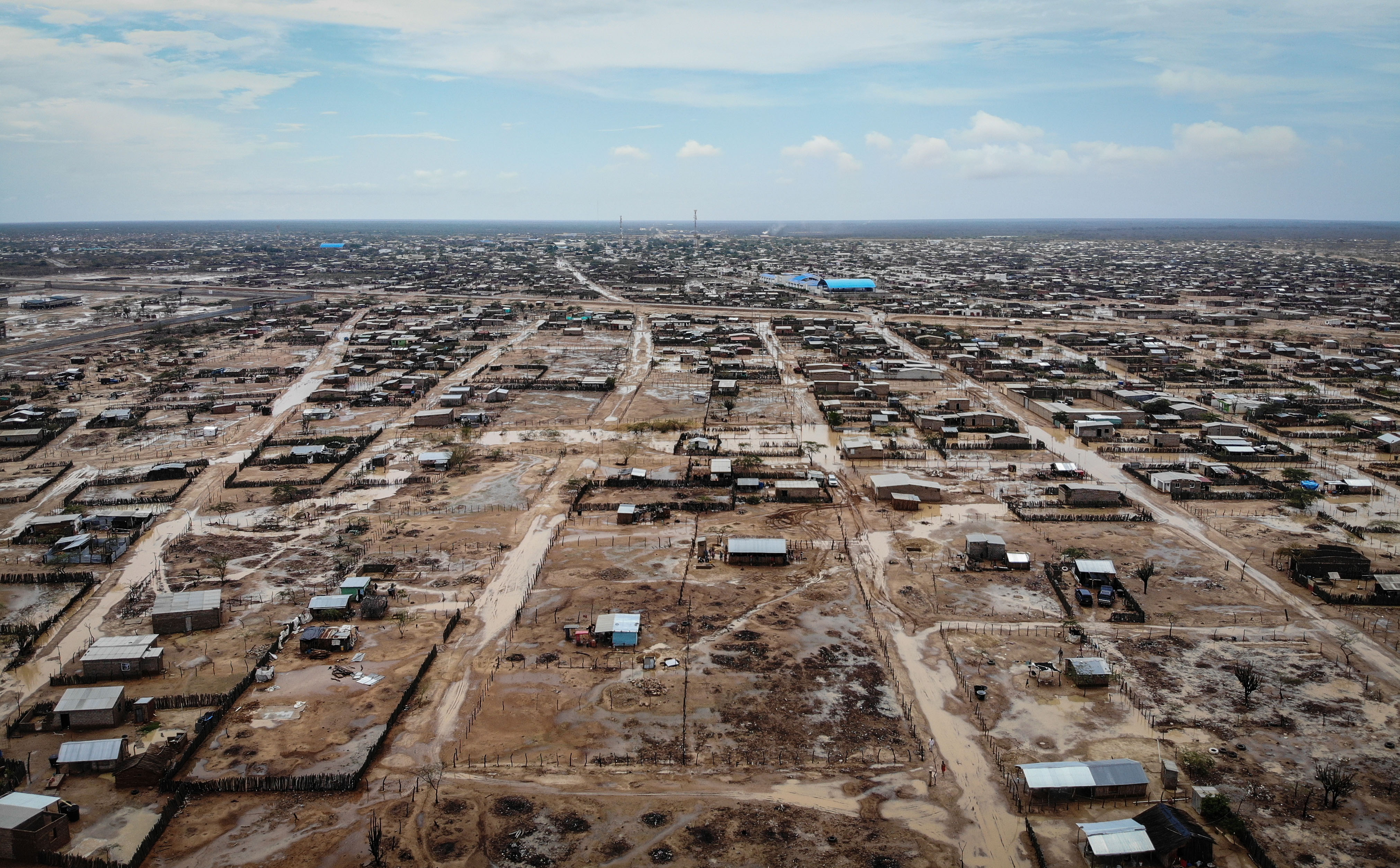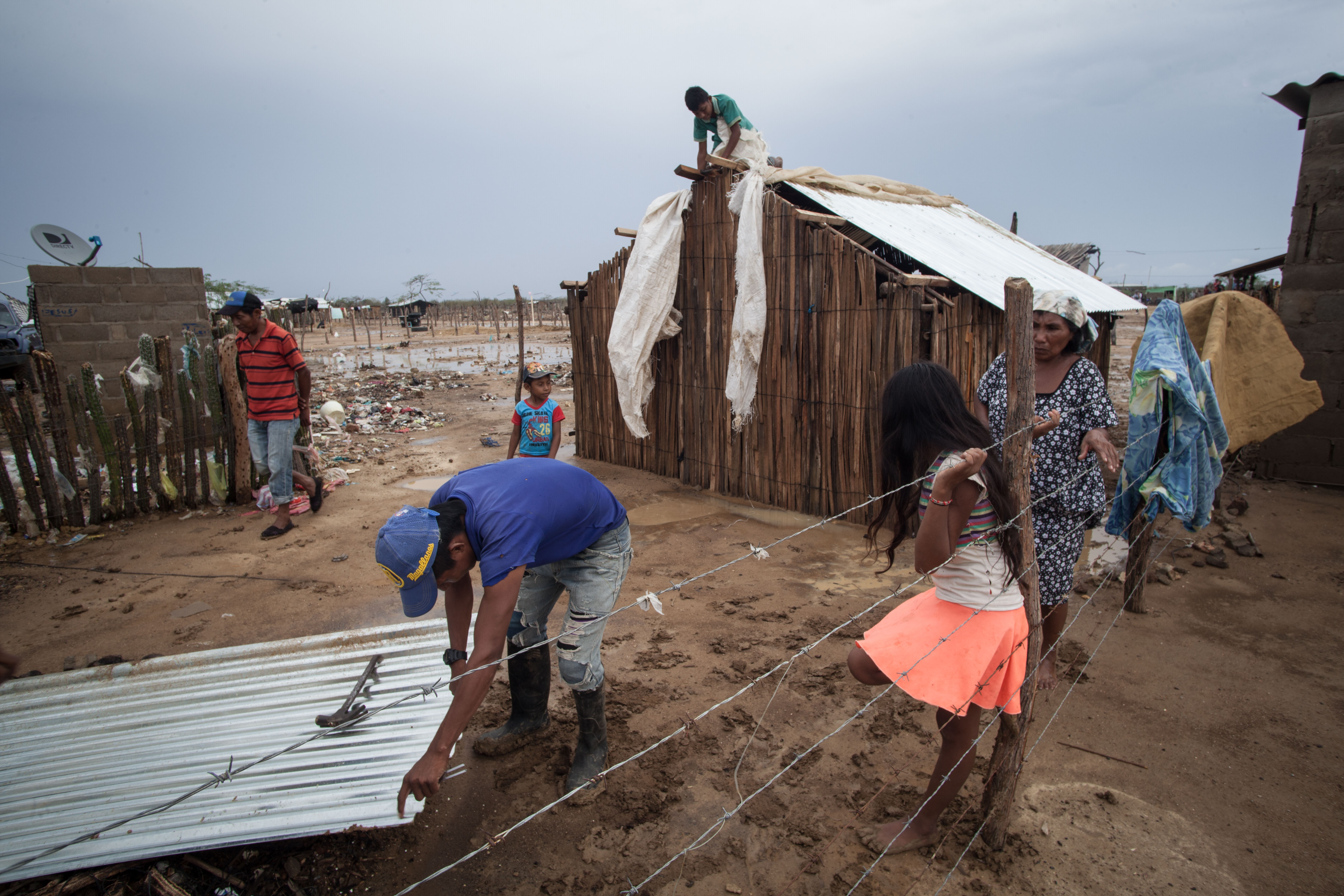 En las afueras de Uribia, hacia el sur, crece con celeridad la invasión Flor del Campo. En junio pasado, unas tres mil personas —entre indígenas wayuu y no indígenas procedentes de Venezuela— se asentaron en un terreno de propiedad del Ejército para construir pequeños ranchos hechos con yotojoro —madera que extraen del cactus—, plásticos, telas y zinc. Levantaron unos mil ranchos. Allí, mujeres, ancianos y niños se resguardan del sol y de las altísimas temperaturas de Uribia, pero también de los torrenciales aguaceros que a mediados de octubre inundaron a esta población.