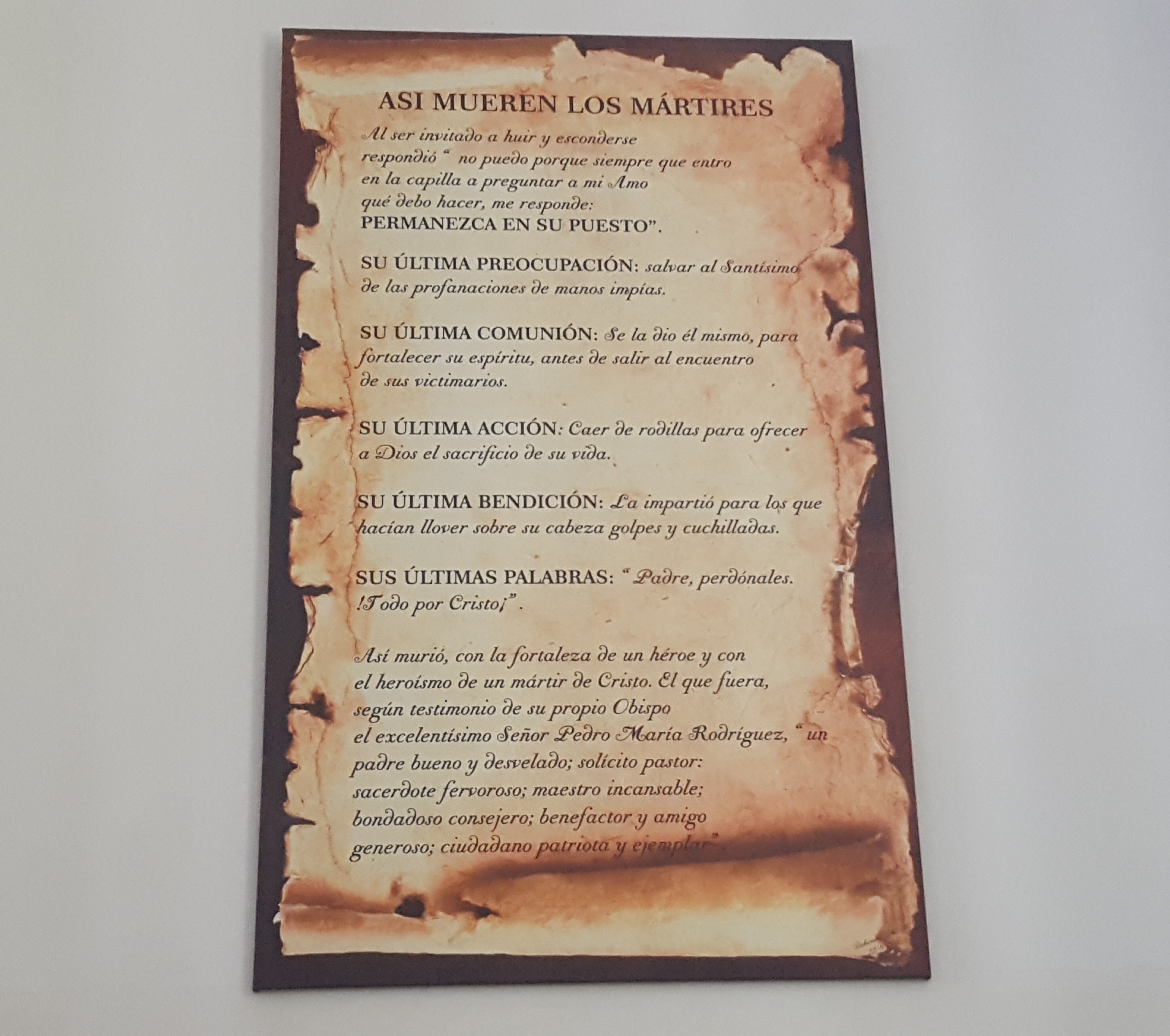 Después de pronunciar estas palabras, el sacerdote toma la última comunión y, a su vez, destruye lo que queda de los elementos sagrados, pues siente que la turba puede profanarlos, y en su encuentro con los asesinos, entre empellones y empujones, es golpeado y azotado con machetes. Es conducido hasta la plaza de Armero, allí es donde la voz de mando se impone: “No más planazos. Denle por el filo”, en cuestión de milésimas de segundos, el filo del machete arremete contra la carne del mártir, el machetazo es dirigido hacia su cabeza y el padre es bañado en sangre, cae de rodillas y expresa las mismas palabras de Cristo: “Padre, perdónales. ¡Todo por Cristo!”. El cuerpo inerte del mártir cae bocabajo, y después, para asegurarse de que definitivamente esté muerto, le dan patadas por arriba y por los costados. Al final, deciden darle un golpe contundente en la cabeza.