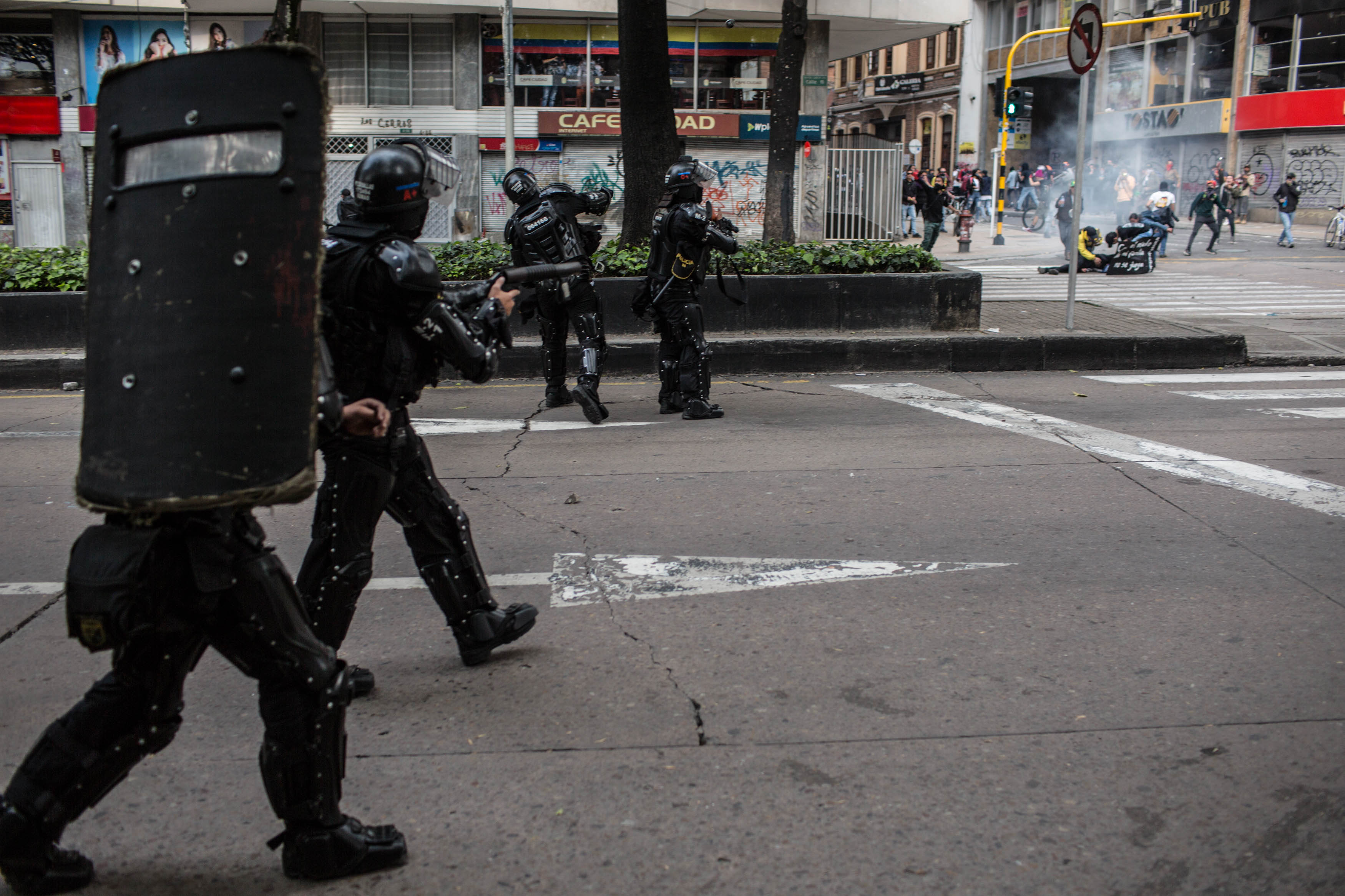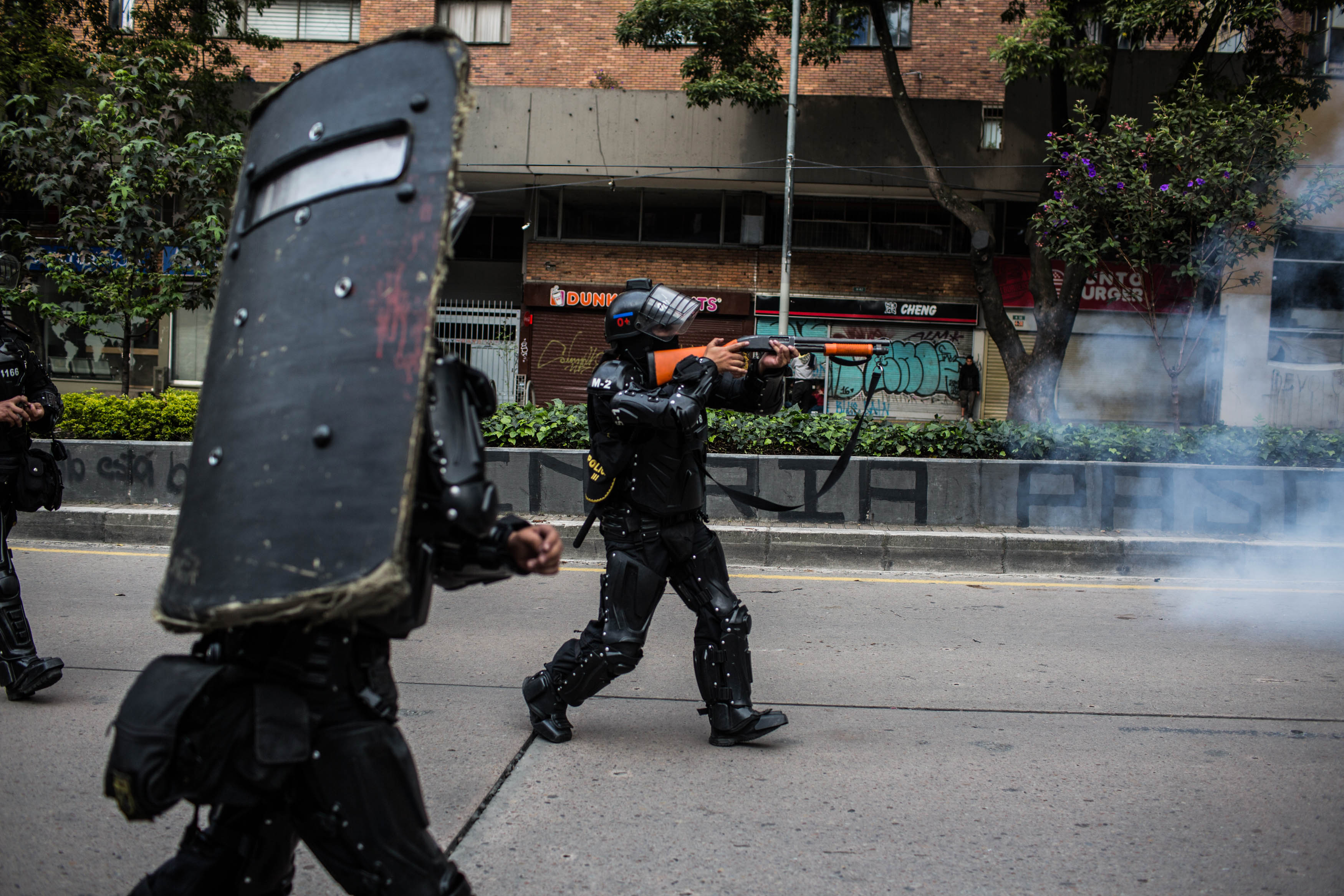 Con esa intención de causar daño coincide Juan David Peña, de 19 años, quien el 21 de noviembre cuando inició el paro, recibió un impacto de gas lacrimógeno que le causó una fractura de tibia. Tiene un mes de incapacidad aunque los médicos le dijeron que podrían ser tres. “Estábamos en son de hacer nuestra protesta pacífica cuando nos empezaron a corretear, quedábamos más cerquita del ESMAD. Estaban disparando los balines que disparan, estaban disparando aturdidoras (...) Antes de que me dispararan a mí, a otro muchacho que estaba tomando fotografías, el ESMAD le disparó también directo a la rodilla y empezó a sangrar muchísimo. Nos empezaron a disparar más seguido y más hacia las piernas de todos nosotros. Después me dispararon a mí”.