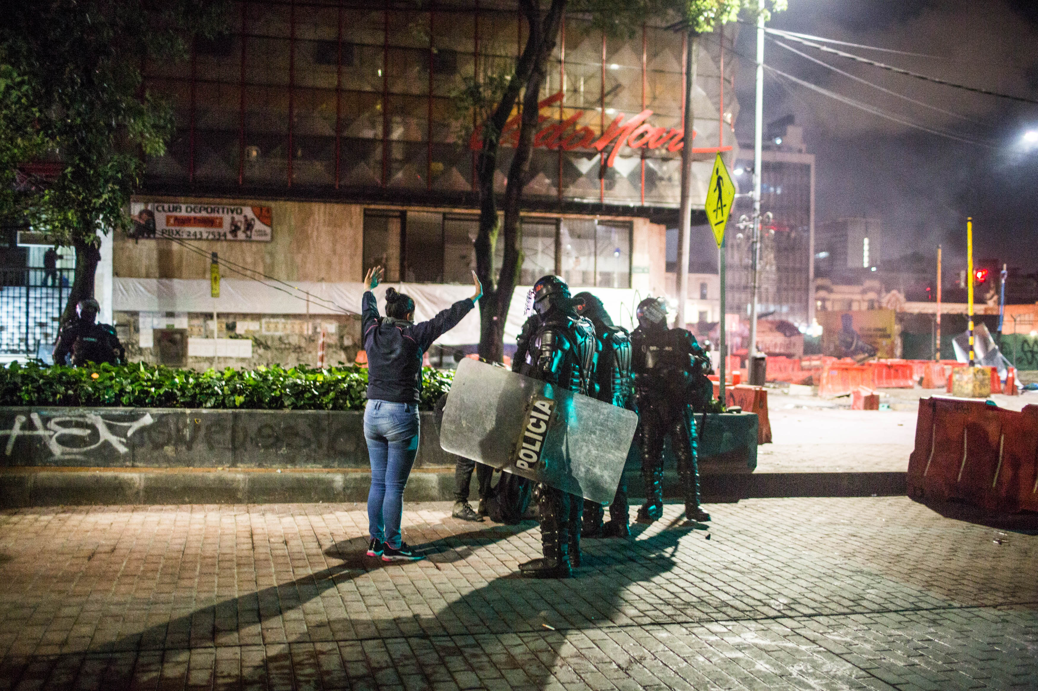 Una mujer alza sus brazos frente a un grupo de policías del ESMAD en el centro de Bogotá en noviembre de 2019. | Crédito: Mauricio Morales – Instagram: @ Mauriciomorales0