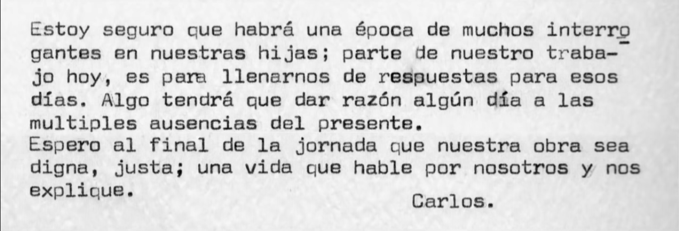 Mi hija menor, María José, escribió un libro que trata sobre su papá. En el libro se encuentran algunas cartas que me enviaba Carlos en los momentos más duros, en los momentos de lejanía, de separación e incertidumbre. En cada carta se refleja la sencillez y la tranquilidad, pero al mismo tiempo la pasión y el amor que emitía Carlos.