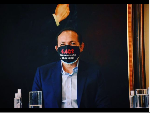 Antonio Sanguino, en su tapabocas tiene la cifra revelada por la JEP, en referencia al número de víctimas por los denominados Falsos Positivos. Fotografía de archivo personal.