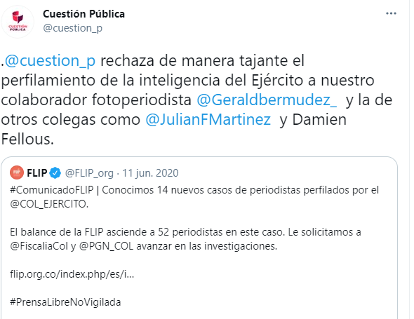 Tweet del medio de comunicación Cuestión Pública sobre perfilamientos a periodistas en el año 2020. Fotografía de Twitter