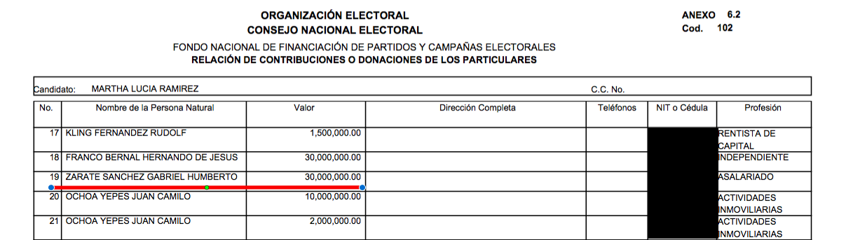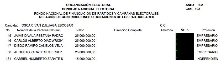 El portal Cuentas Claras del Consejo Nacional Electoral reporta que G.H. Zárate donó 30 millones de pesos a la campaña de la candidata por el Partido Conservador a la Presidencia de la República, Marta Lucía Ramírez, en 2014. Ese mismo año, tanto G.H. Zárate como Zárate Gutiérrez, aparecen como aportantes de $235.294,12 (por cabeza) a cada uno de los 85 candidatos de la lista cerrada del Centro Democrático. Un total de 40 millones de pesos: 20 millones de Gabriel Humberto y 20 millones de la empresa Inversiones Zárate Gutiérrez S.A.S., de la cual Augusto Zárate es primer suplente del representante legal. Diego Canelos patrocinó la campaña presidencial de Enrique Peñalosa, candidato de la Alianza Verde, con 50 millones de pesos, en 2014.
