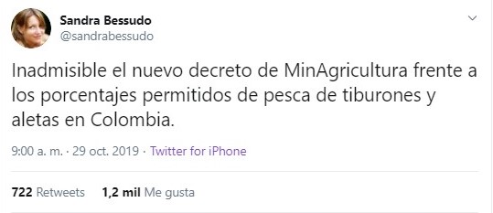 Cuatro días después de publicada la resolución 350 de 2019, Sandra Bessudo alertó desde su cuenta de Twitter (@sandrabessudo) sobre los posibles riesgos a la biodiversidad colombiana generados por esta decisión. “Inadmisible el nuevo decreto de MinAgricultura frente a los porcentajes permitidos de pesca de tiburones y aletas en Colombia”, escribió Bessudo.