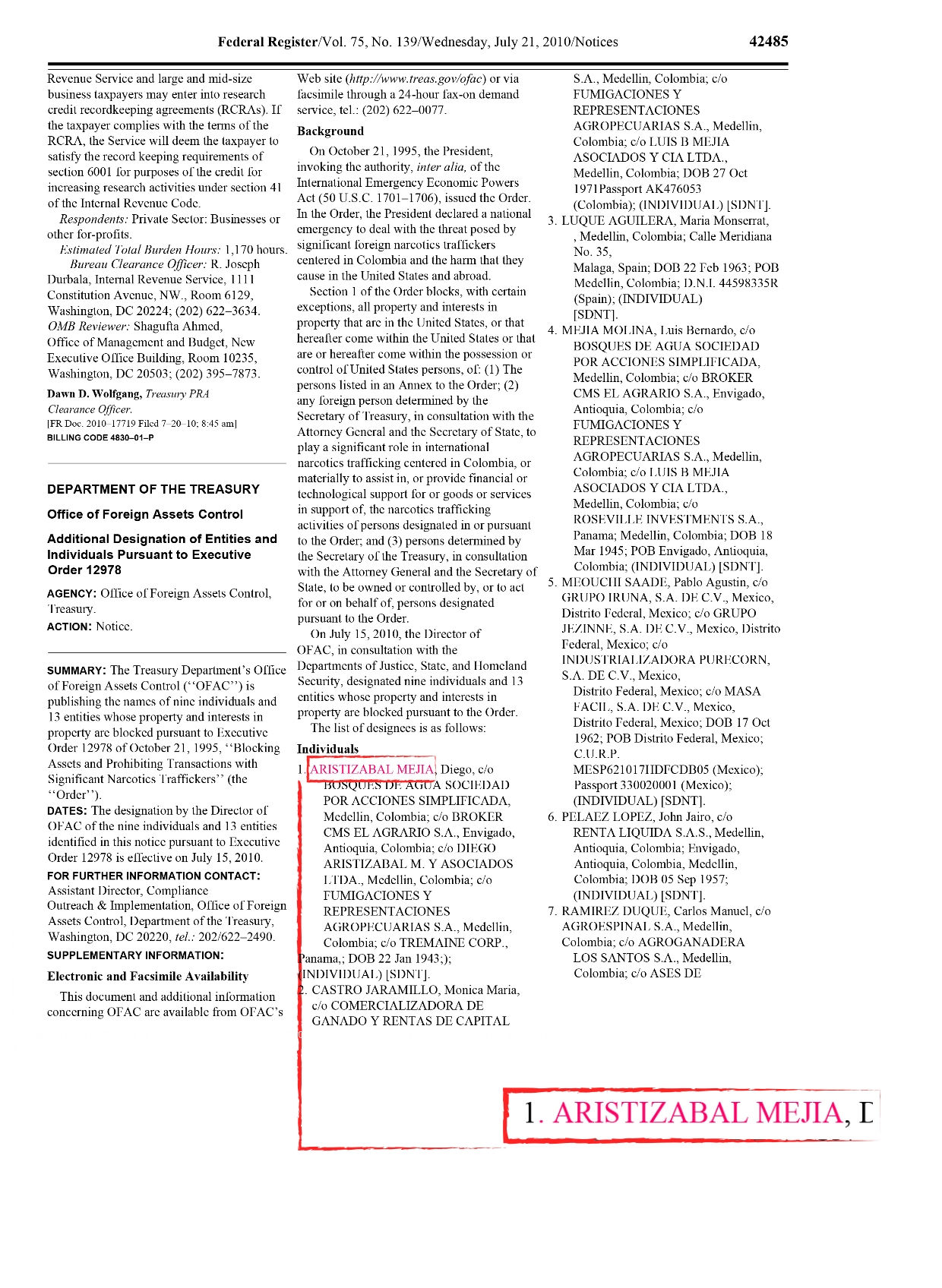 Diego Aristizábal en la Lista Clinton del Departamento del Tesoro de Estados Unidos.