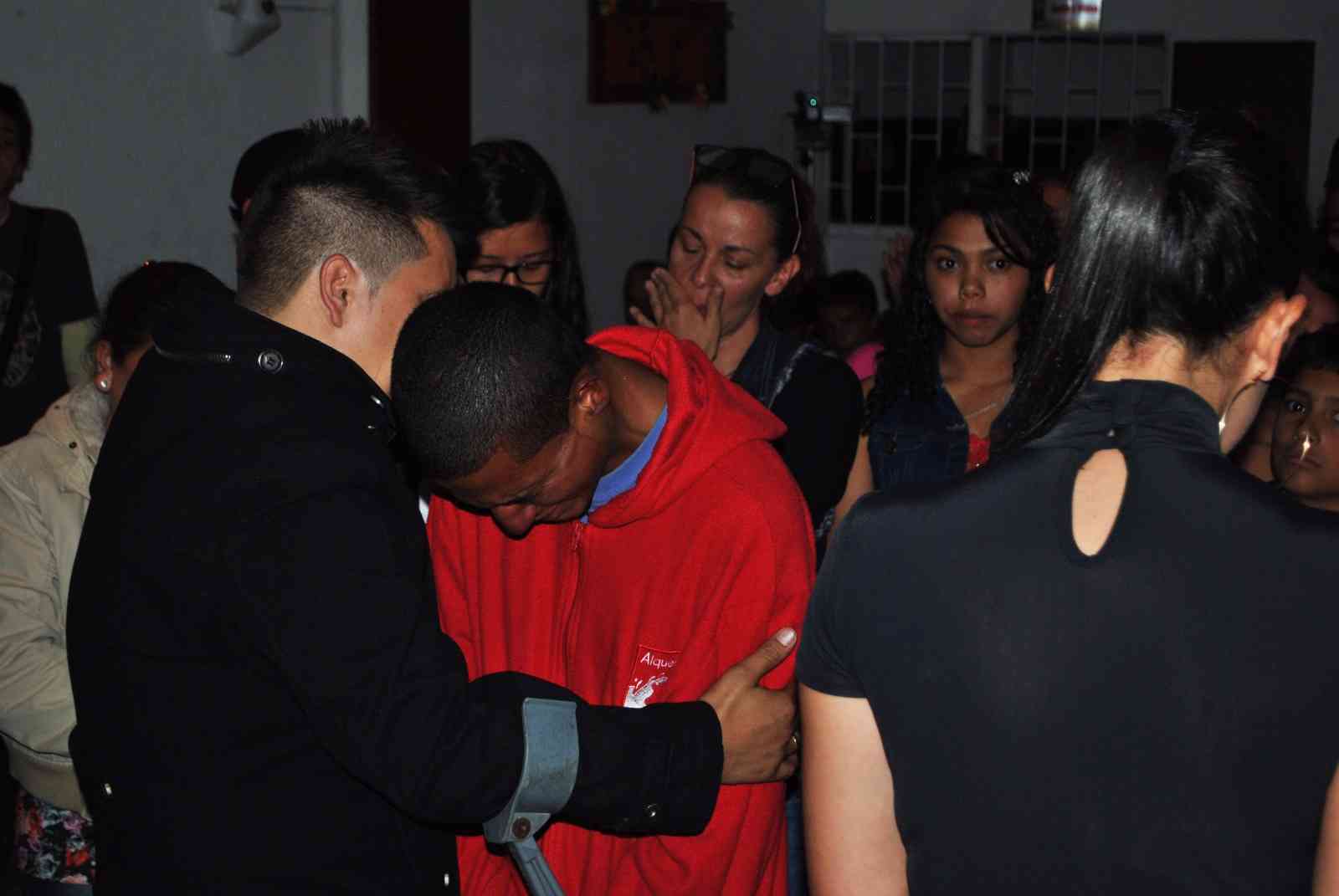 Para comenzar todos cierran sus ojos y Álex dirige una oración, de sus labios solo salen palabras suaves, y se presenta. Muchos allí lo conocen por su aparición en diferentes novelas como ‘Pandillas guerra y paz’ en la que recreó el personaje de “Mateito” o por “Nano” en la serie ‘De pies a cabeza’. Es confuso ver la diferencia de expresiones en los rostros de los oyentes, las madres solo piensan en sus hijos, los hijos piensan en su futuro y qué sería de ellos si estuvieran en esa situación. Álex comienza hablando de su madre, una mujer -dice él-, a la que le tuvo gran odio. Cuando tenía 5 meses de nacido ella trató de asfixiarlo.