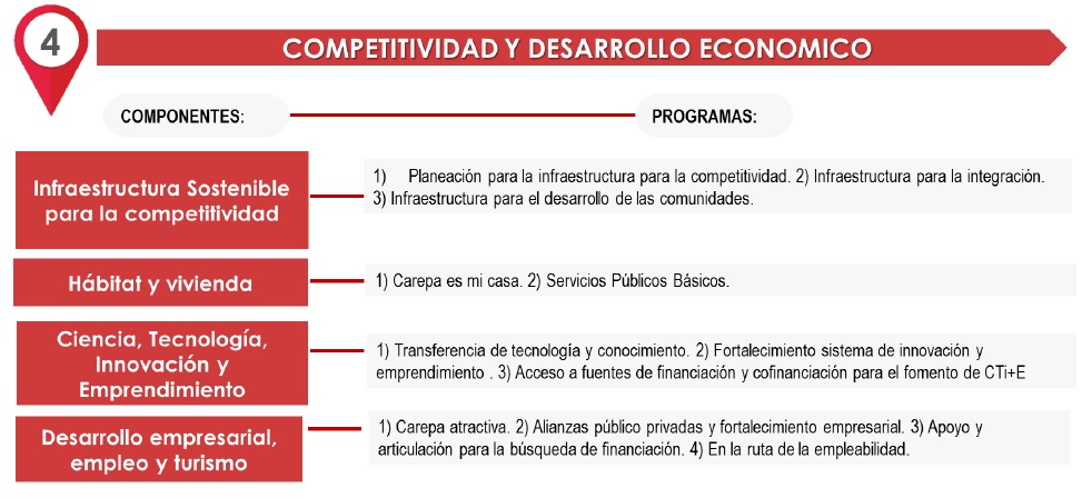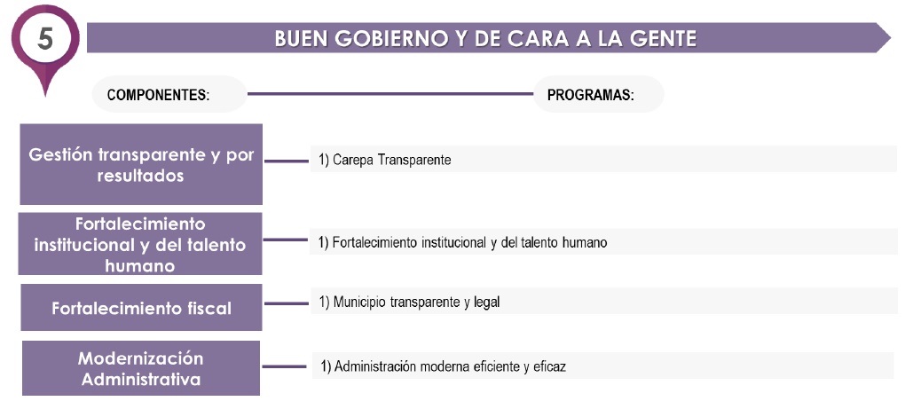 En comparación con la página 242 del Plan Desarrollo “Carepa Positiva”, hay tres partes idénticas: “Fortalecimiento institucional y del talento humano”, “Administración moderna eficiente y eficaz” y, en la columna de los componentes, “Modernización Administrativa”.
