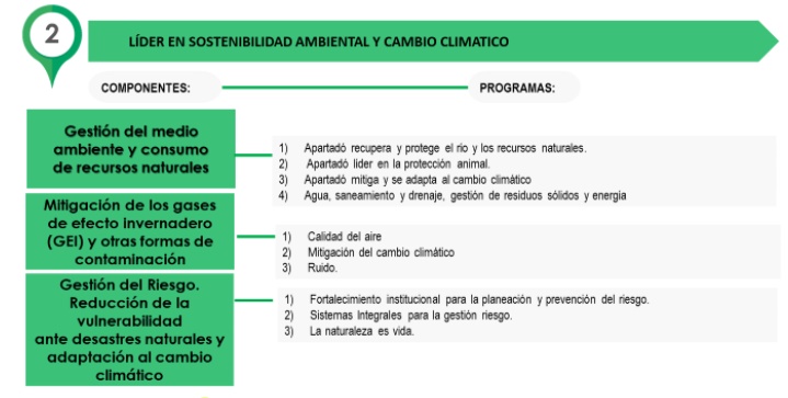 En la página 10 del programa “Apartadó, ciudad líder”, se explica lo que propone el candidato en materia de sostenibilidad ambiental y cambio climático.