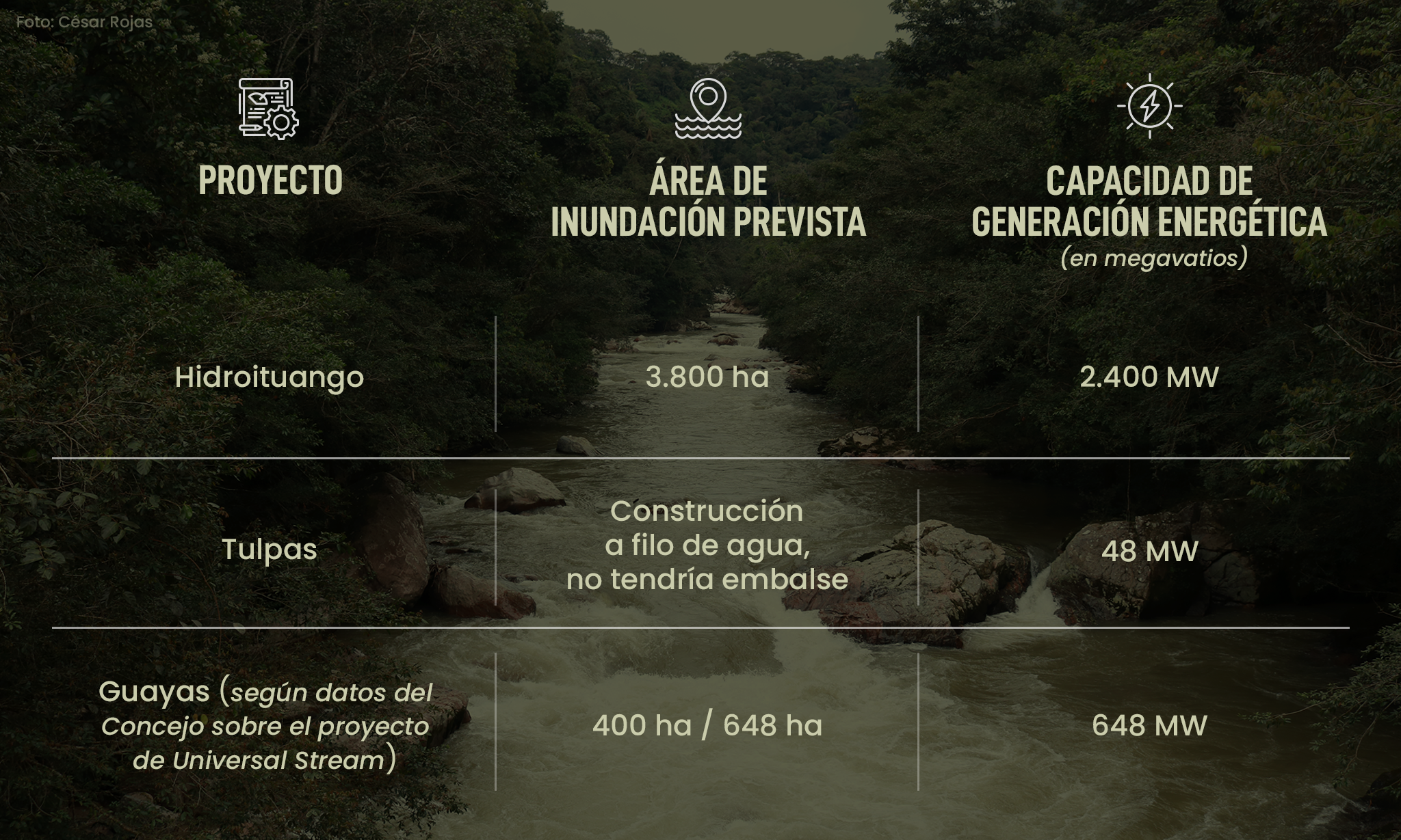 En relación con otros proyectos como El Quimbo o Hidroituango, las centrales hidroeléctricas que se planean construir en el Caquetá son más pueñas. Específicamente, según la clasificación que establece el Ministerio de Minas, tanto la de Tulpas como la de Guayas tienen el tamaño de “centrales hidroeléctricas” porque su capacidad instalada superaría los 20 MW. Y aunque no tendrán la capacidad de otros proyectos, eso no implica que su impacto sea menor y en cambio sí generan la pregunta sobre realmente qué tan necesaria es su construcción.
