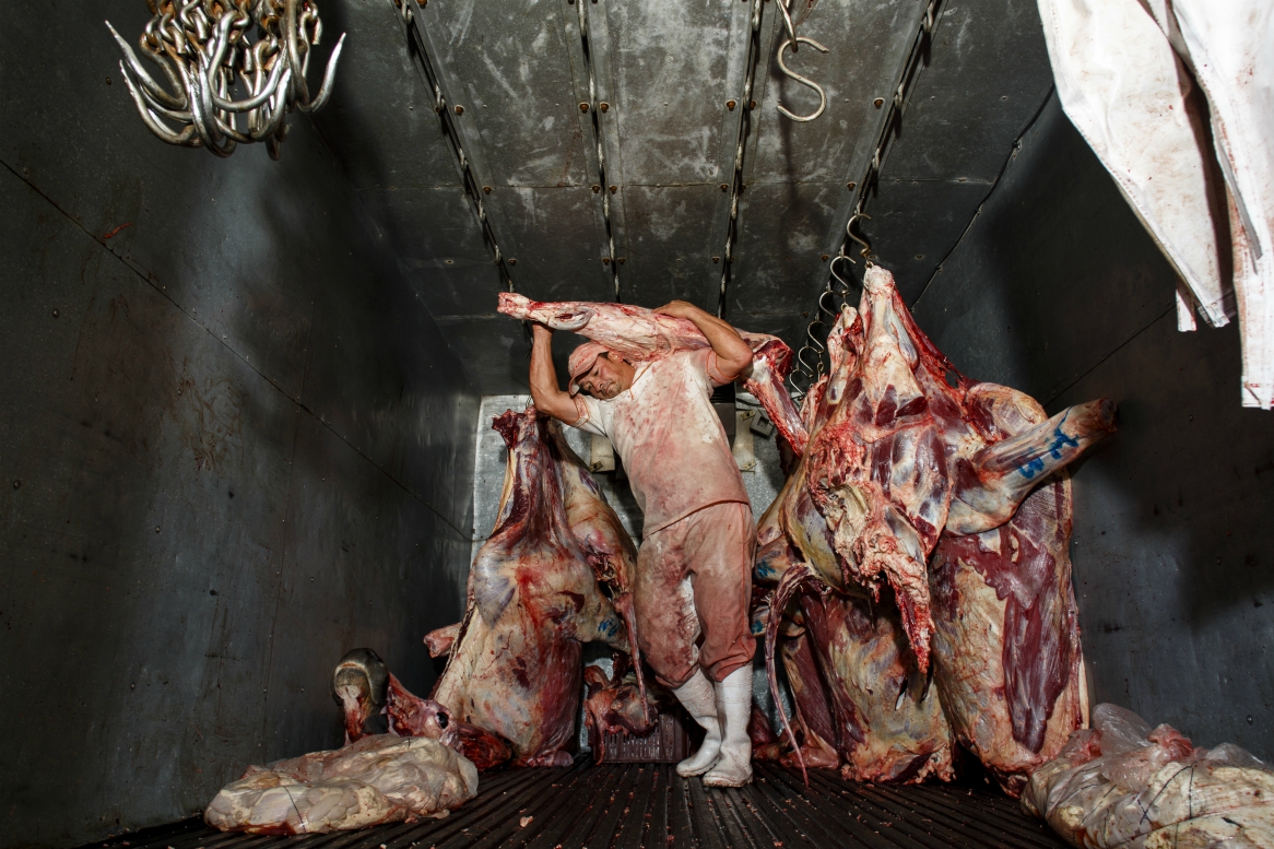 Un carnicero descarga su pieza desde el camión de reparto para llevarlo a su carnicería en Jardín, Antioquia. (Foto: Daniel Estrada)