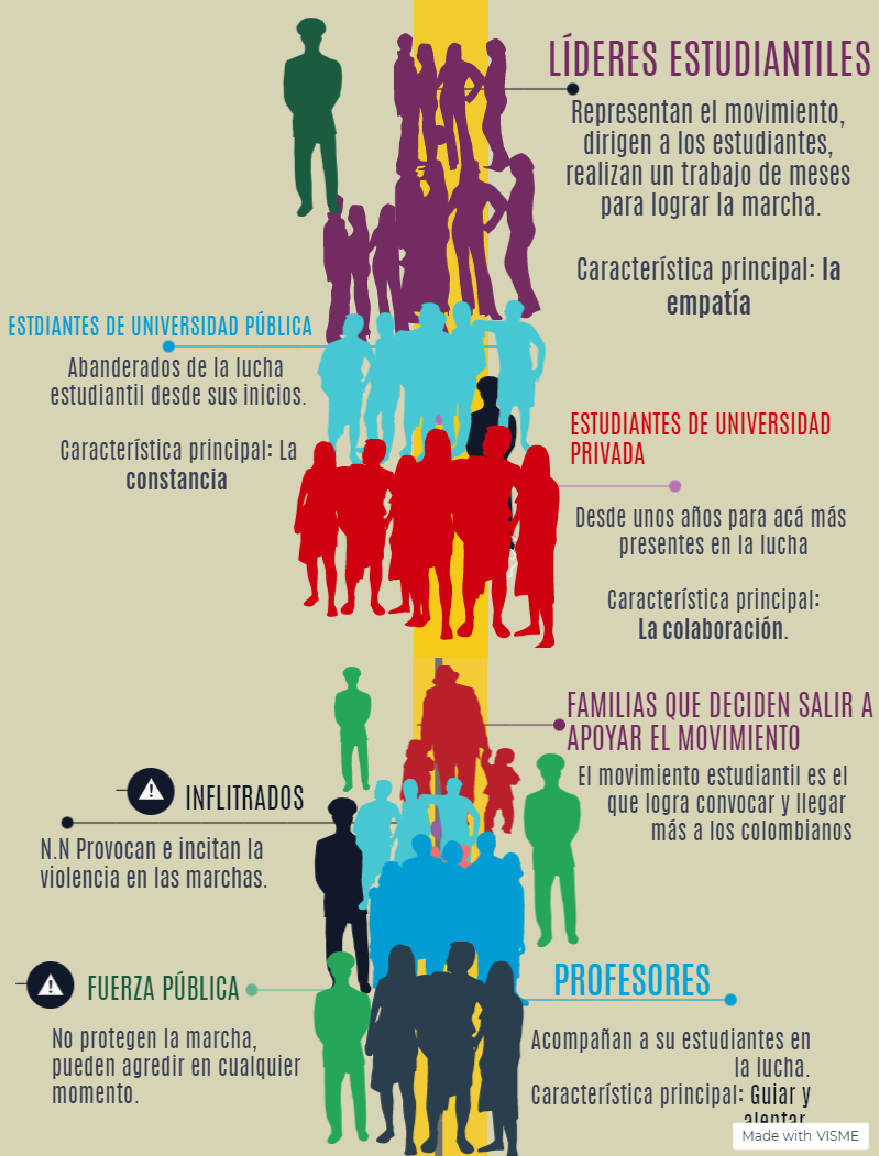 Los líderes están de acuerdo, tanto en Colombia como en el resto del mundo, que para una marcha se deben disponer de elementos de autoprotección para los manifestantes, teniendo en cuenta los antecedentes de hechos violentos cometidos por la fuerza pública. Pero más allá de lo difícil y riesgoso que puede ser para los estudiantes salir a las calles, el movimiento estudiantil se caracteriza por su alegría, su creatividad y sus intervenciones artísticas, en las cuales las calles se llenan de color que reclaman una lucha que está lejos de acabarse, pues la meta de todos los líderes estudiantiles es alcanzar una educación superior gratuita y de calidad para todos, ese es el norte, para el cual aún falta un largo camino por andar.