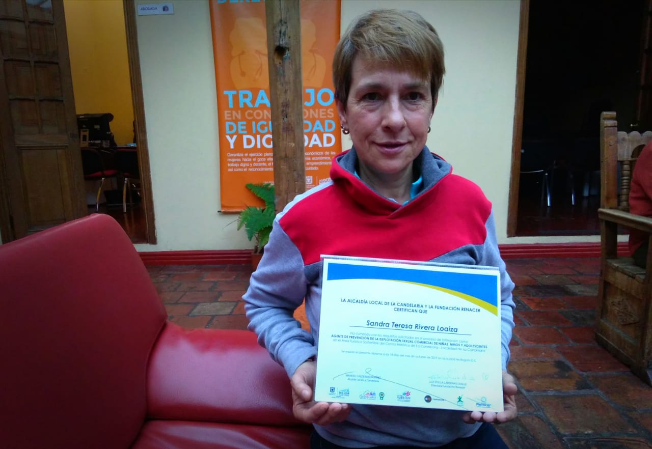 Mujer protectora, amable, emotiva, cordial y luchadora, eso significa el nombre Sandra, según su origen latín, y sí, así es exactamente Sandra Rivera, una mujer colaboradora no solo con cada una de las personas que hacen parte de la red de mujeres de la localidad de La Candelaria y de la Fundación Renacer, ella trata de serlo con todos a su alrededor, siendo una líder y una agente preventiva contra el abuso sexual en adolescentes.