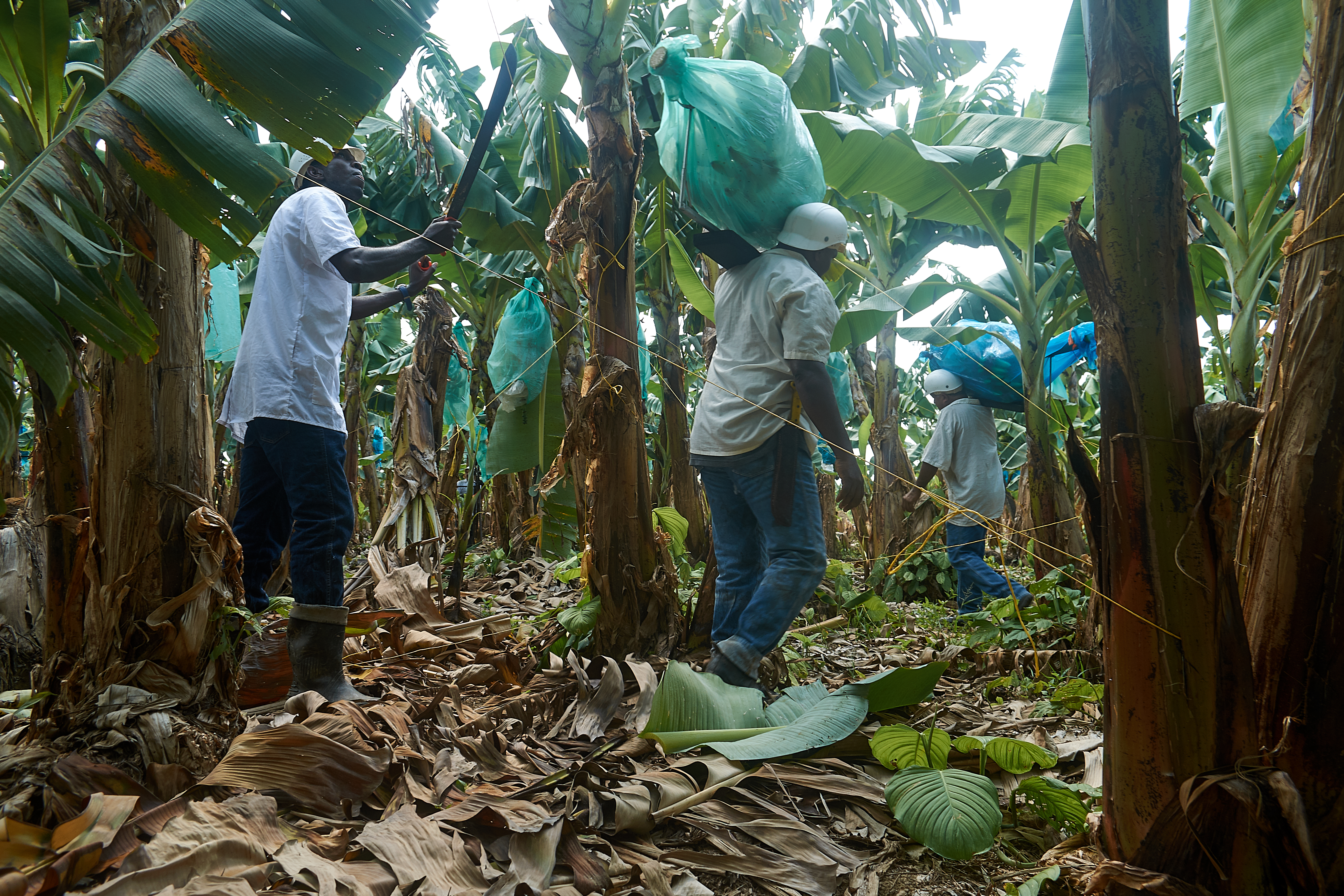 Las labores en los cultivos de banano durante las tareas de fumigación representan riesgos para la salud de los trabajadores. Varios han perdido la vista por la caída de químicos. Foto: Pacifista y La Liga Contra el Silencio.