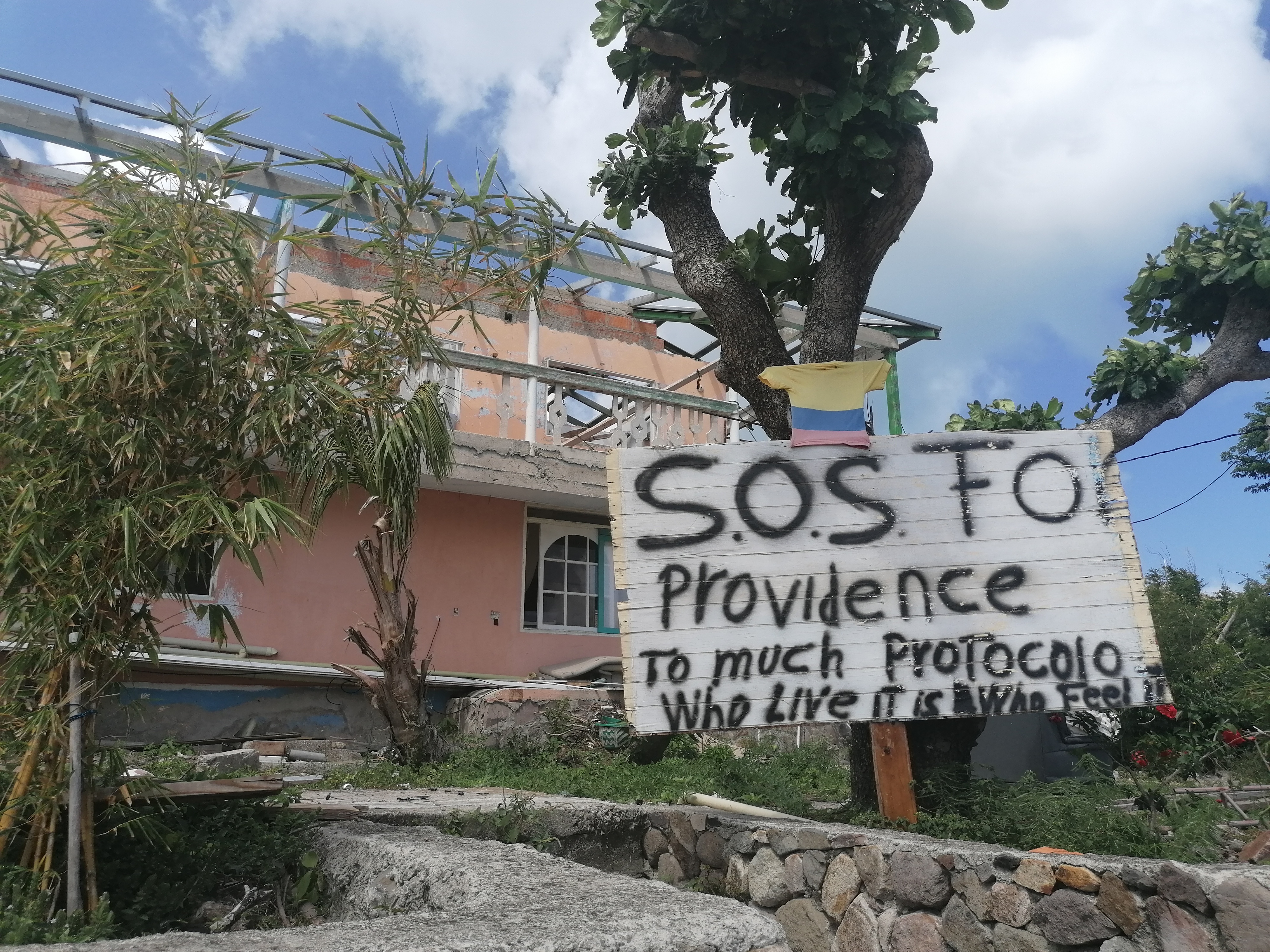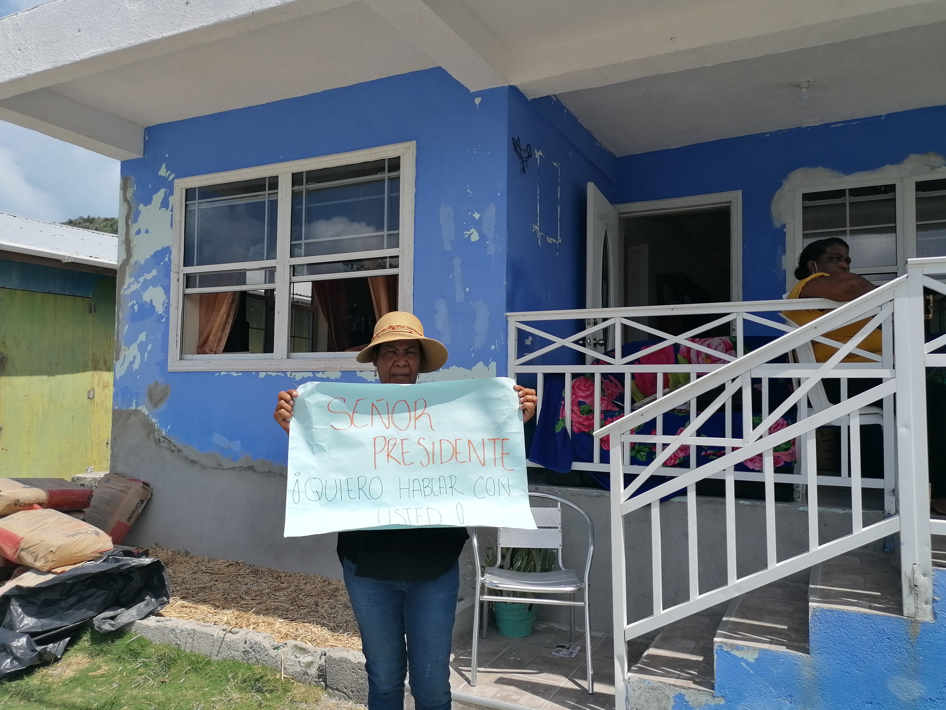 Una mujer de Providencia le pide audiencia al presidente Duque a través de una pancarta. Entre la comunidad reina la desesperación y el miedo por la llegada de la temporada de huracanes, entre junio y noviembre. Crédito: La Liga Contra el Silencio.