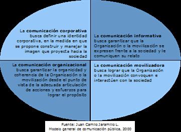 Esta propuesta, entiende por comunicación pública aquella que se da en la esfera pública  o colectiva, bien sea para construir bienes públicos (política); para incidir en la agenda pública (mediática); para comunicar a las entidades del Estado con la sociedad (estatal); para construir sentido compartido al interior de la organización (organizacional) o como resultado de las interacciones propias de los movimientos sociales (de la vida social) (Jaramillo, 2005).