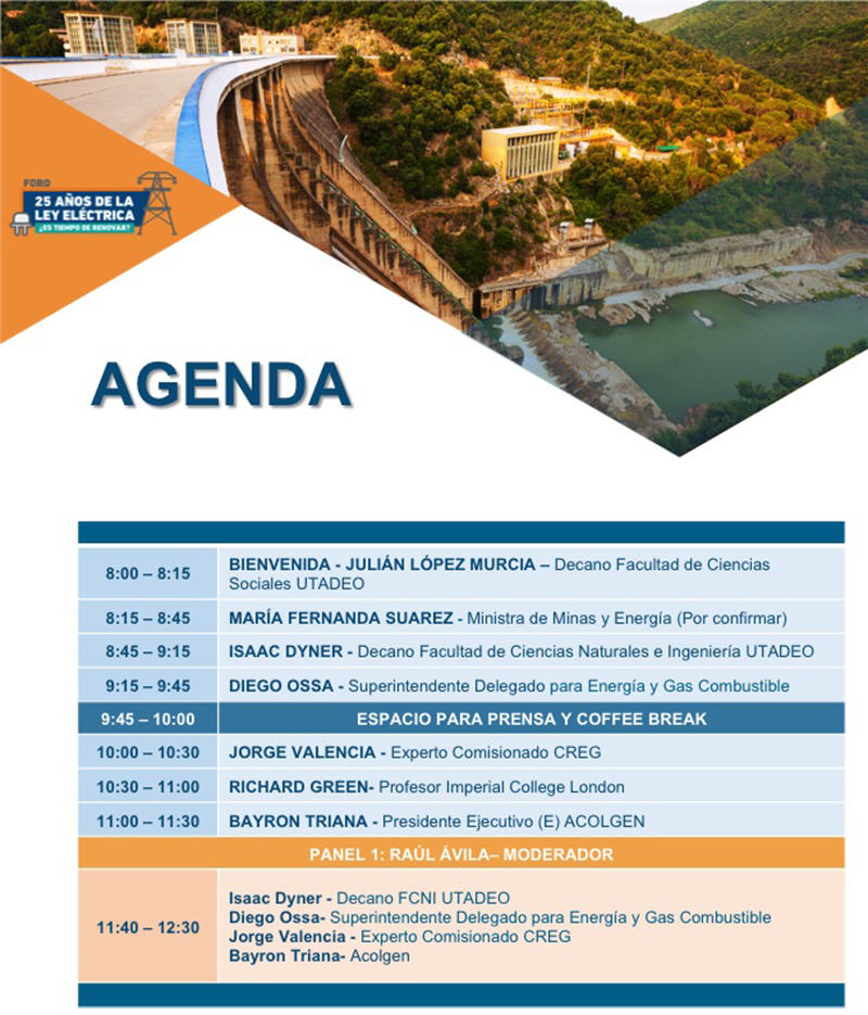 En cuanto a académicos reconocidos en el sector estarán Ricahrd Green, del Imperial College London, y el decano de la Facultad de Ciencias Naturales e Ingeniería de Utadeo y miembro de la Junta Directiva de XM, Isaac Dyner. De igual forma, participará en el panel Rául Ávila, experto en gestión regulatoria en CENIT y exasesor en energía en del Departamento Nacional de Planeación.