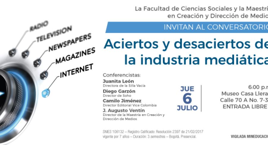 El próximo jueves 6 de julio, a las 6 p. m. en la Casa Lleras (calle 70A #7-35), cuatro directores de medios de comunicación colombianos se sentarán a dialogar sobre los aciertos y desaciertos de la industria mediática. El evento, promovido por la Maestría en Creación y Dirección de Medios de Utadeo, pretende generar un cruce de miradas y enfoques entre los diferentes invitados.