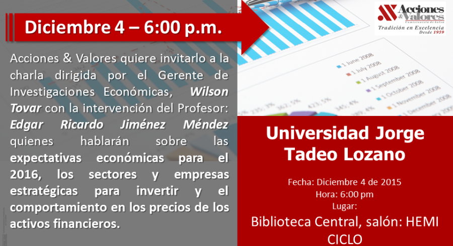 Charla dirigida por Wilson Tovar Gerente de investigaciones Económicas de Acciones y Valores Comisionista de Bolsa que contará con la participación del profesor Edgar Jiménez Méndez profesor de finanzas y coordinador académico de la Especialización en Gerencia en Gobierno y Gestión Pública.
