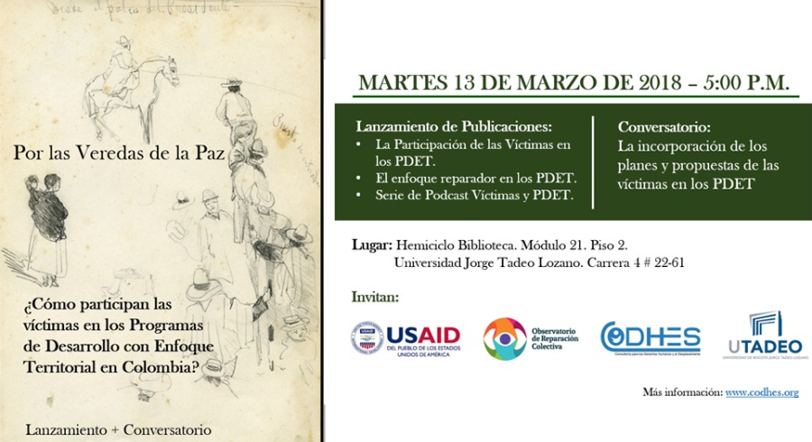 El martes 13 de marzo en el Hemiciclo de Utadeo tendremos el lanzamiento de Publicaciones de PDET y Víctimas y el Conversatorio: La incorporación de los planes y propuestas de las víctimas en los PDET.