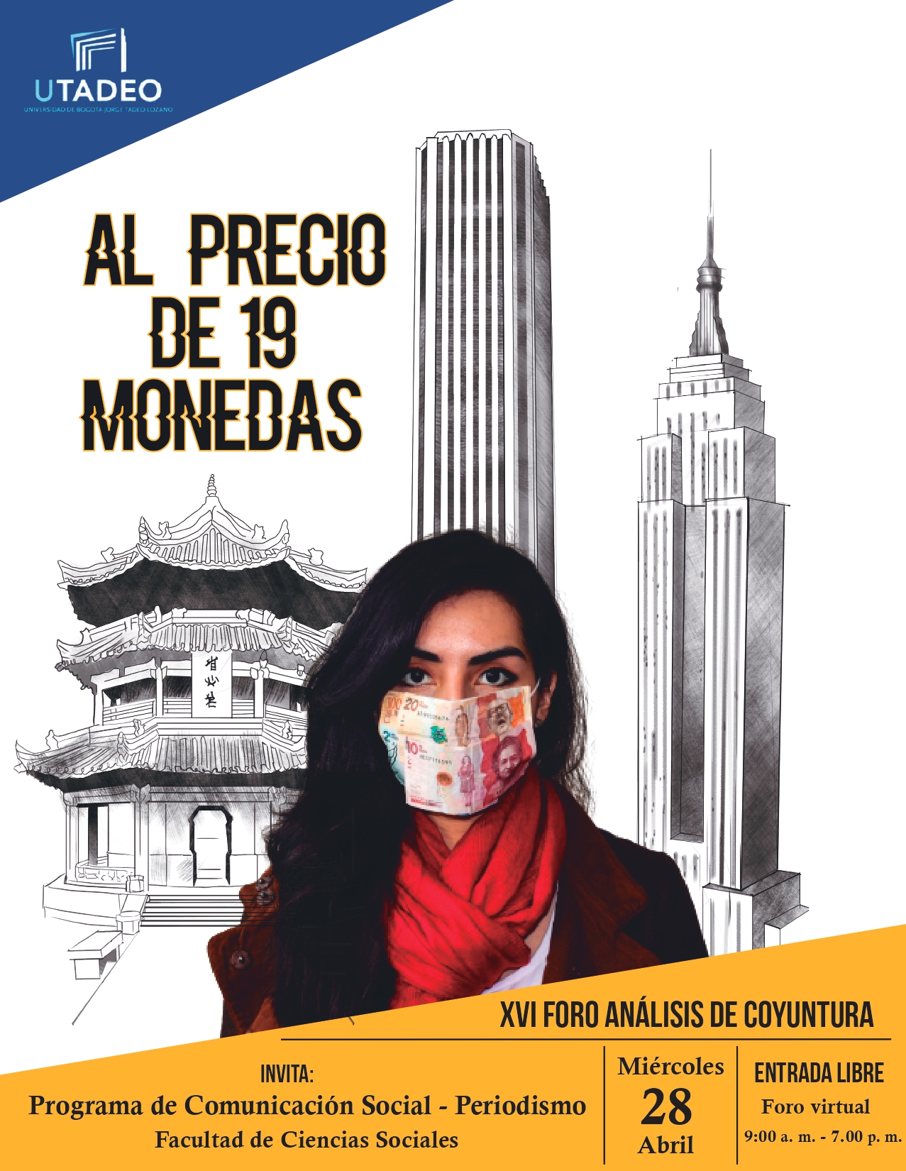 Te invitamos a participar en el XVI foro de análisis de coyuntura: “Al precio de 19 monedas”, organizado por los estudiantes del programa de Comunicación Social - Periodismo de Utadeo, bajo la dirección de la docente de la asignatura, Gloria Consuelo Valencia. Este espacio estará diseñado para conocer las múltiples problemáticas que la pandemia del COVID-19 ha agudizado en el contexto económico, mental y educativo, entre otros. En esta oportunidad, contaremos con varios bloques, los cuales serán explicados por todos los estudiantes del primer semestre del año 2021; durante todo el evento abordaremos temáticas de suma importancia para el público en general con el fin de concientizar y mostrar una problemática que nos involucra a todos. El evento, que contará con la presencia de varios invitados especiales, se llevará a cabo el día 28 de abril, de 9:00 a.m. a 7:00 p.m. ¡Te esperamos!