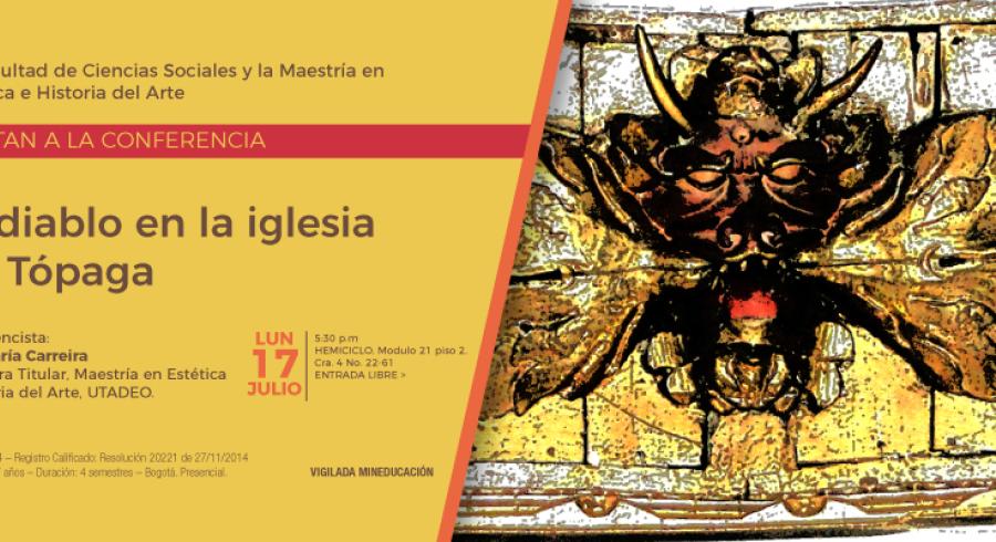 El lunes 17 de julio a las 5:30 en el Hemiciclo de Utadeo, se llevará a cabo la conferencia "El diablo en la iglesia de Tópaga", con la intervención de Ana María Carreira, profesora del Departamento de Humanidades. Este evento está organizado por la Facultad de Ciencias Sociales y la Maestria en Estética e Historia del Arte.