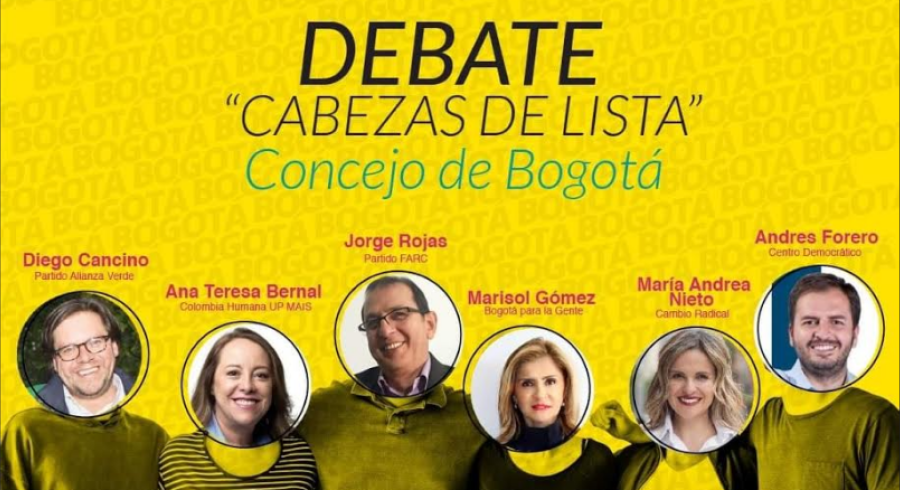 En el debate tendremos la presencia de Ana Teresa Bernal de Colombia Humana UP MAIS; Andrea Nieto de Cambio Radical; Marisol Gómez Giraldo de Bogotá Para la Gente; Diego Cancino del Partido Alianza Verde; Jorge Rojas del partido Farc; y Andrés Forero del Centro Democrático.