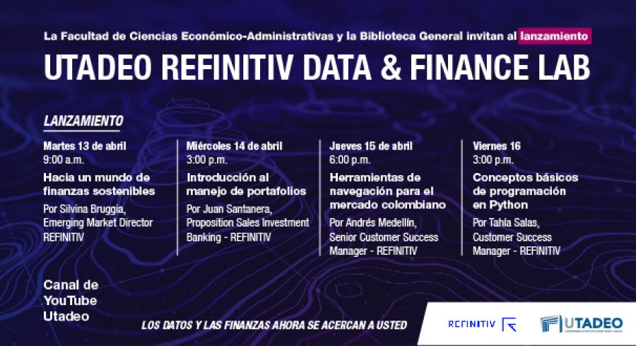 Como parte del lanzamiento de nuestro Laboratorio Financiero, la facultad de Ciencias Económico-Administrativas y la Biblioteca de Utadeo, en una alianza con la compañía en soluciones tecnológicas financieras Refinitiv, te invitan al ciclo de conferencias virtuales: “Utadeo Refinitiv Data & Finance Lab”, que se llevará a cabo del 13 al 16 de abril, a través del canal oficial de la Universidad en YouTube.