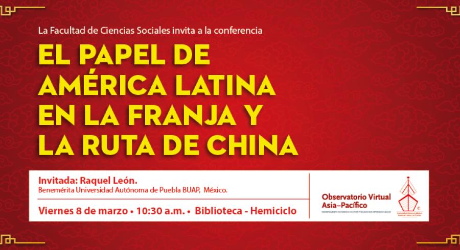 El Observatorio Virtual Asia Pacífico los invita este viernes 08 de marzo a la conferencia El Papel de América Latina en la Franja y la Ruta de China con la participación Raquel León de la Benemérita Universidad Autónoma de Puebla. La maestra León es una reconocida sinóloga que hablará sobre una de las iniciativas más importantes del gobierno de Xi Jinping en la que ha buscado unir a China no sólo con Europa sino con el mundo entero.