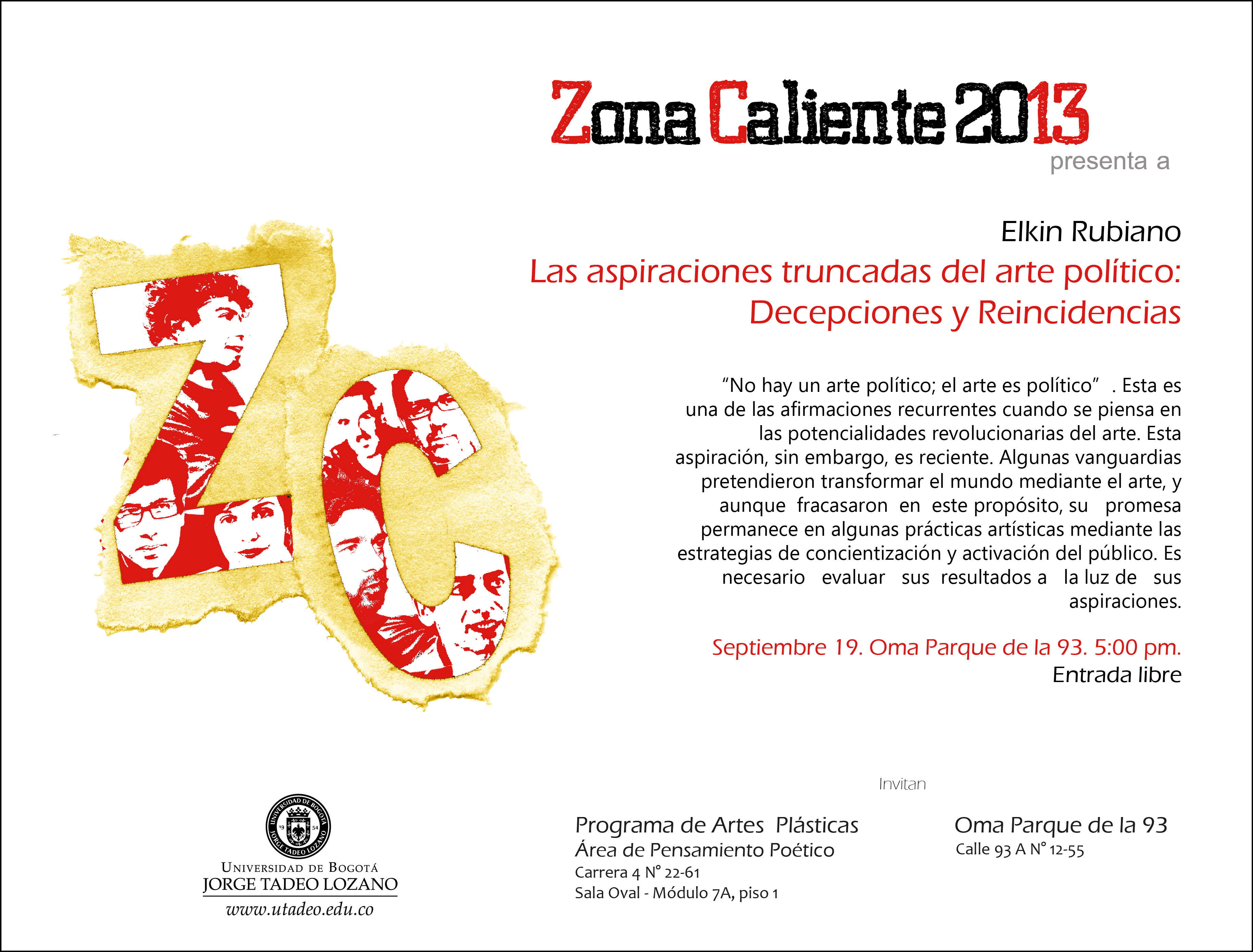 El 19 de septiembre de 2013, en Oma del Parque de la 93, La Zona Caliente presentó a Elkin Rubiano con la conferencia Las aspiraciones truncadas del arte político: decepciones y reincidencias: