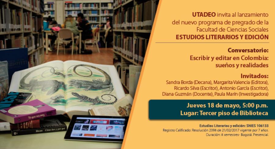 El próximo 18 de mayo a las 5:00 pm, el tercer piso de la biblioteca de Utadeo se llenará de literatura. En este espacio se hará el lanzamiento del nuevo programa de Estudios Literarios y Edición, que contará con la presencia de reconocidos editores, escritores y académicos. Entre ellos, Sandra Borda, decana de la Facultad de Ciencias Sociales de la Universidad; Diana Guzmán, docente y doctora en literatura, Ricardo Silva, escritor y columnista de El Tiempo; Antonio García, escritor, guionista y editor; Margarita Valencia, directora de la Maestría en Estudios Editoriales del Instituto Caro y Cuervo; y Paula Marín, investigadora y doctora en literatura.