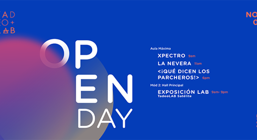 Este 9 de noviembre, de 9:00 a.m. a 9:00 p.m., te invitamos a ‘parchar’ con Tadeo Lab, en el Open Day. Si lo tuyo es crear y explorar sin límites el mundo de la ciencia y el arte, descubre todo lo que este Laboratorio tiene para ti, a través de las conferencias, talleres y exposiciones que se llevarán a cabo en esta jornada.