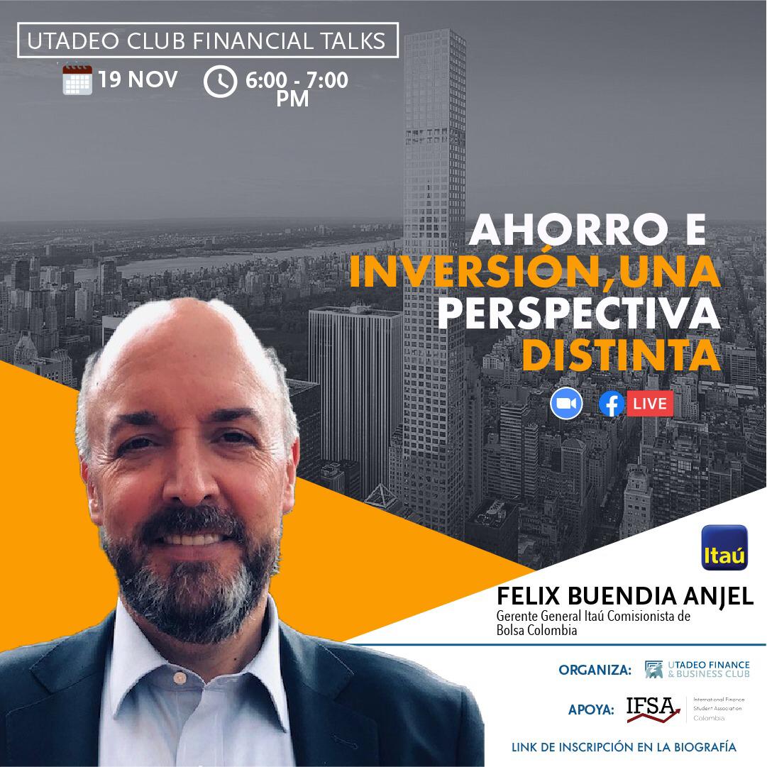 El Club de Finanzas de Utadeo (Utadeo Finance & Business Club), invita a todo el público a participar de la tercera charla del ciclo de conferencias web denominado "Utadeo Club Financial Talks", con la participación de Félix Buendia Anjel, gerente general de Itaú Comisionista de Bolsa en Colombia, con la charla “Ahorro e inversión, una perspectiva distinta”, desde las 6:00 p.m., por la página oficial de Facebook del Club de Finanzas de Utadeo.