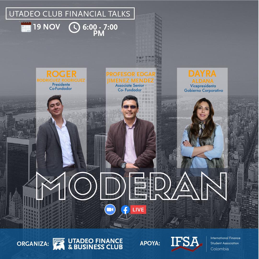 Además, la charla será moderada por el director del Laboratorio Financiero de Utadeo, Edgar Jiménez; Dayra Aldana, vicepresidenta de Gobierno Corporativo, y Roger Rodríguez, co-fundador del Club de Finanzas, en un espacio pensado especialmente para promover, apoyar y reforzar la educación financiera del país con ayuda de los mejores referentes económicos y financieros nacionales.