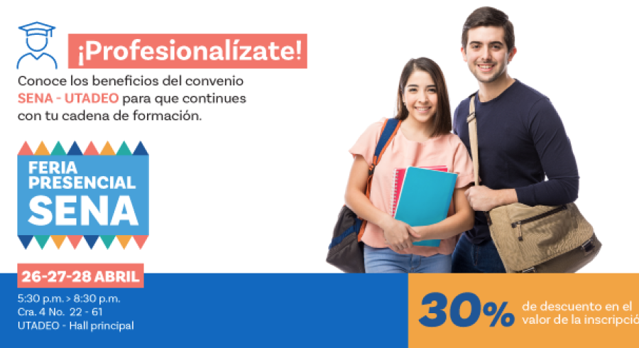Durante los días 26, 27 y 28 de abril, en horario de 5:30 a 8:30 p.m. la Universidad recibirá a los Técnicos y Tecnólogos del SENA interesados en continuar su cadena de formación y profesionalizarse en Utadeo.