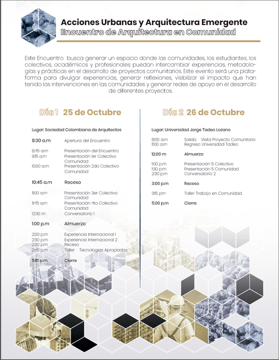 El 25 y 26 de octubre, vive un diálogo entre las comunidades, estudiantes, colectivos, académicos y profesionales en torno al desarrollo de proyectos comunitarios en arquitectura. Inscríbete aquí.