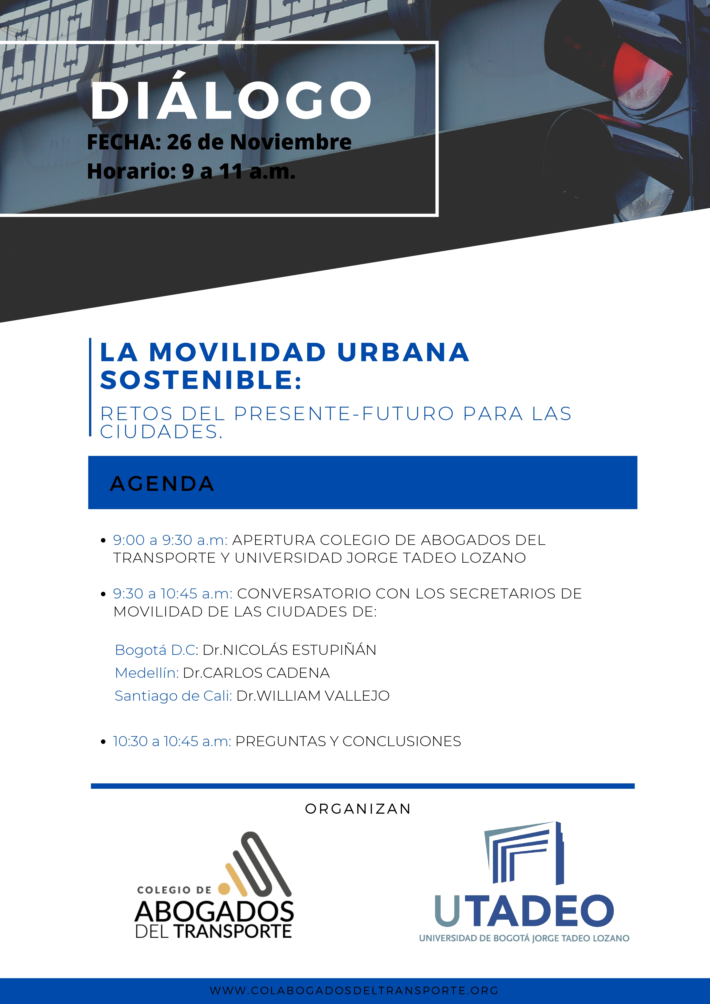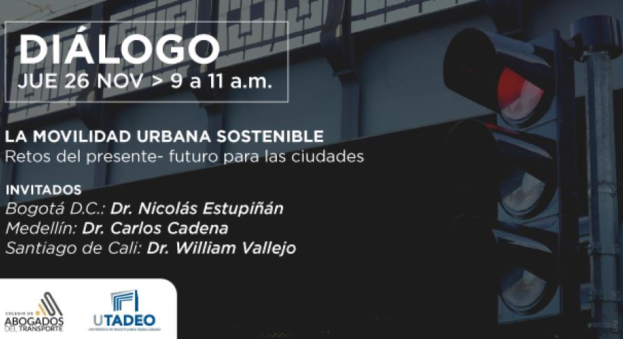 Con la participación de los secretarios de Movilidad de Bogotá, Medellín y Cali: Nicolás Estupiñán, Carlos Cadena y William Vallejo, se llevará a cabo el diálogo sobre “La movilidad urbana sostenible: retos del presente-futuro para las ciudades”, este jueves 26 de noviembre, de 9:00 a 11:00 a.m., a través de Zoom.
