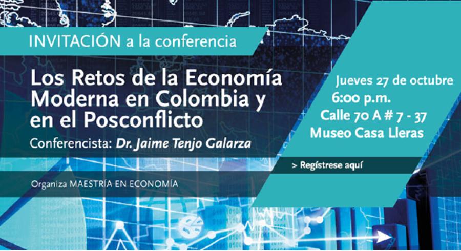 La Facultad de Ciencias Económicas Administrativas - Maestría en Economía, tiene el gusto de invitarlo a la Conferecia "Los Retos de la Economía Moderna en Colombia y en el Posconflcito",el jueves 27 de octubre de 2016 a partir de las 6:00 p.m., en el Museo Casa Lleras. El evento contará con la intervención del Dr. Jaime Tenjo Galarza.