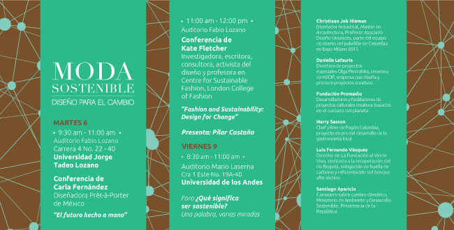 ​En este año se han juntado las universidades Jorge Tadeo Lozano y de los Andes en un evento donde se comparte una sola mirada en cuanto a la sostenibilidad, no solamente en el ámbito académico y educativo sino también en el tema de empresa y producción de la moda. Se ha invitado como cierre de la semana de la moda sostenible a un panel de expertos en diferentes campos de la sostenibilidad. Se verán miradas de colombianos en arquitectura, gastronomía, producto, medio ambiente y moda.