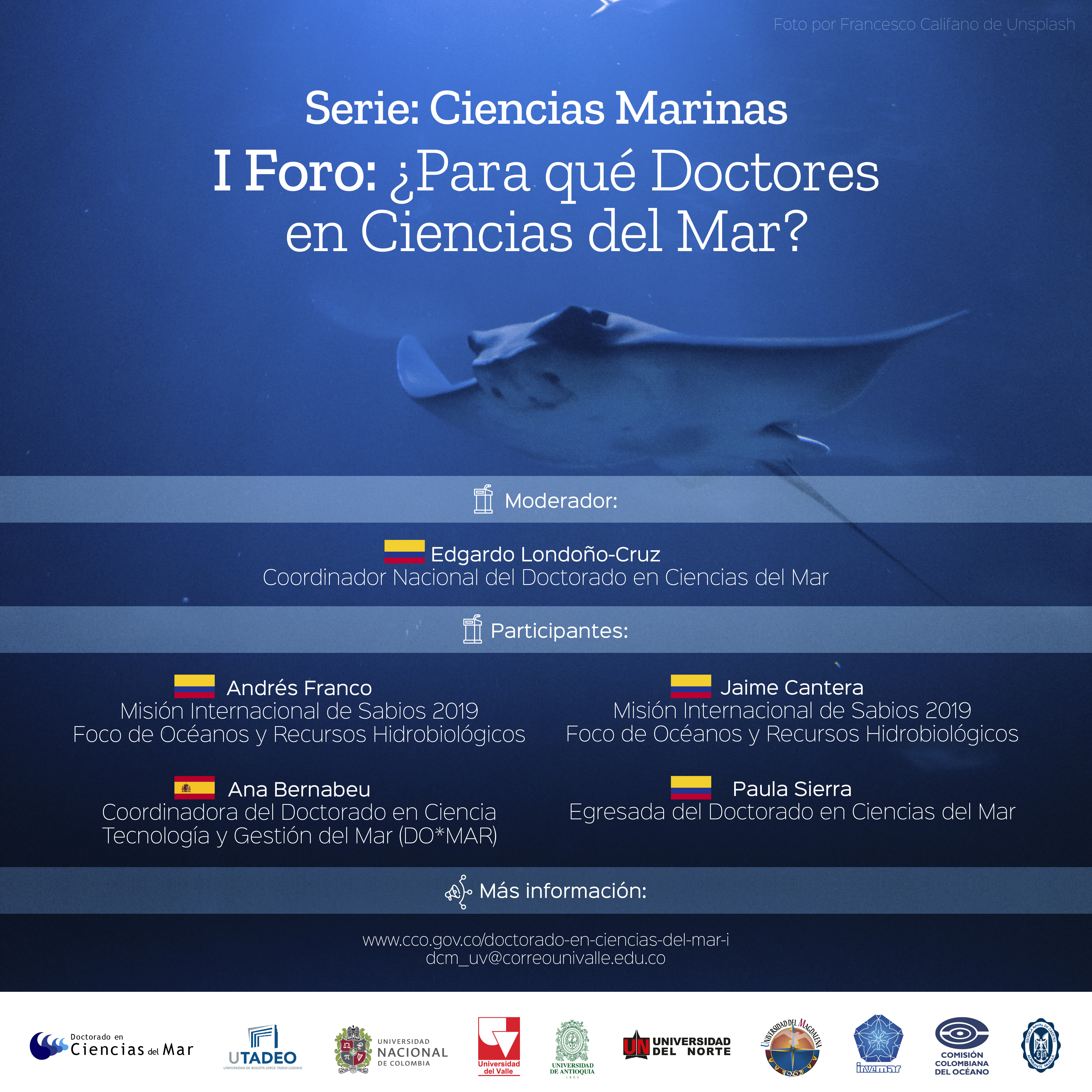 La importancia de los doctorados en ciencias del mar en el desarrollo de nuestros países es el tema principal del primer foro de la serie de ciencias marinas que organizan las instituciones de educación superior que ofrecen el programa de Doctorado en Ciencias del Mar, como una iniciativa de país que responde a la necesidad de formar investigadores al más alto nivel para enfrentar los retos que tiene Colombia en la protección y uso sostenible de sus ambientes y recursos marinos y costeros.
