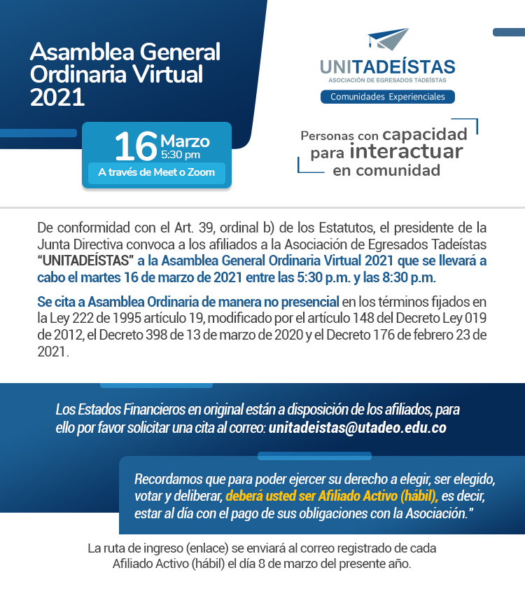Participa en la Asamblea General Ordinaria Virtual 2021 de Unitadeístas 16 de Marzo - 2021 Participa en la Asamblea General Ordinaria Virtual 2021 de Unitadeístas 5:30 pm Universidad Jorge Tadeo Lozano mailing_unitadeistas_asamblea.jpg