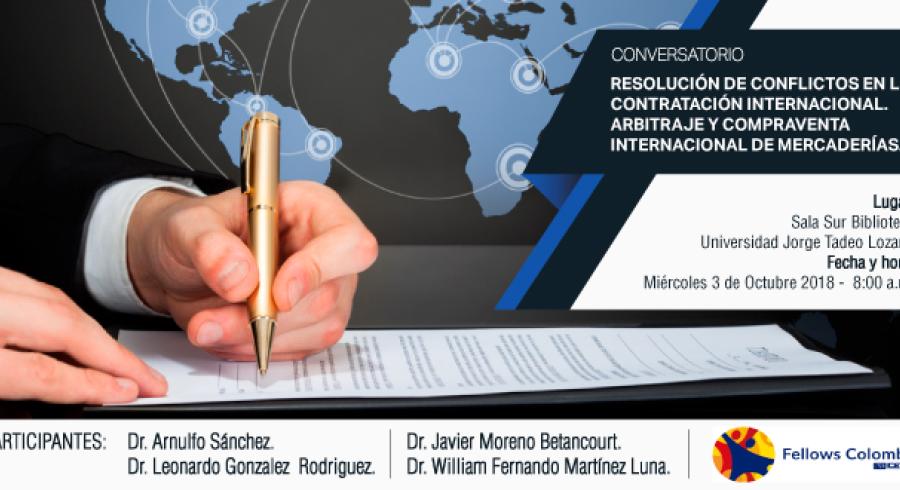 El miércoles 3 de octubre a las 8:00 a. m. se llevará a cabo el conversatorio Resolución de conflictos en la contratación internacional. Arbitraje y Compraventa internacional de mercaderías. Este evento contará con la participación de: