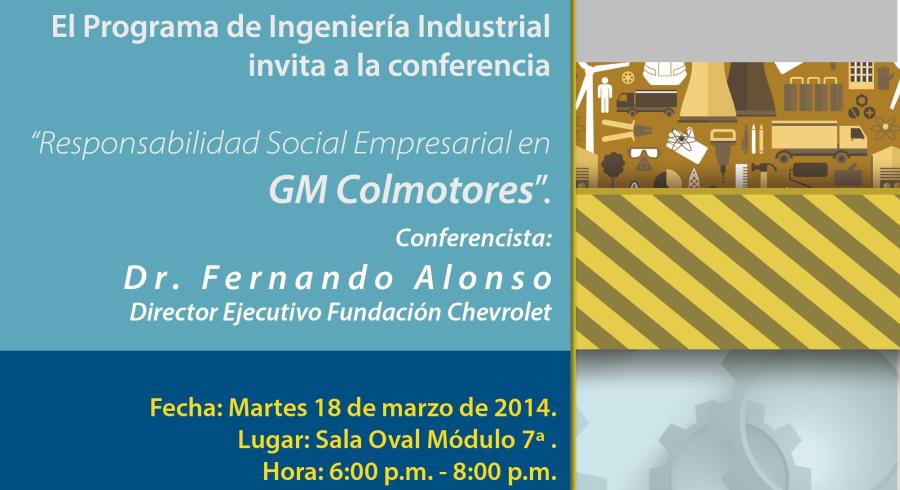 El Programa de Ingeniería Industrial invita a la conferencia "Responsabilidad Social Empresarial en GM Colmotores", el martes 18 de marzo de 6 a 8PM, Sala Oval, Módulo 7A.