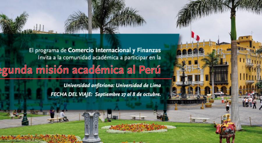 Durante el tercer periodo acedemico la Universidad Jorge Tadeo Lozano y el programa de Comercio Internacional realizaran su segunda mision academica al Peru. Invitamos a toda nuestra comunidad academica a participar masivamente en el. sera la oportunidad de viajar a una delas economias mas prosperas de region y vincularse con una de las universidade mas pretigiosas de la cuidad de Lima (Universidad de Lima).