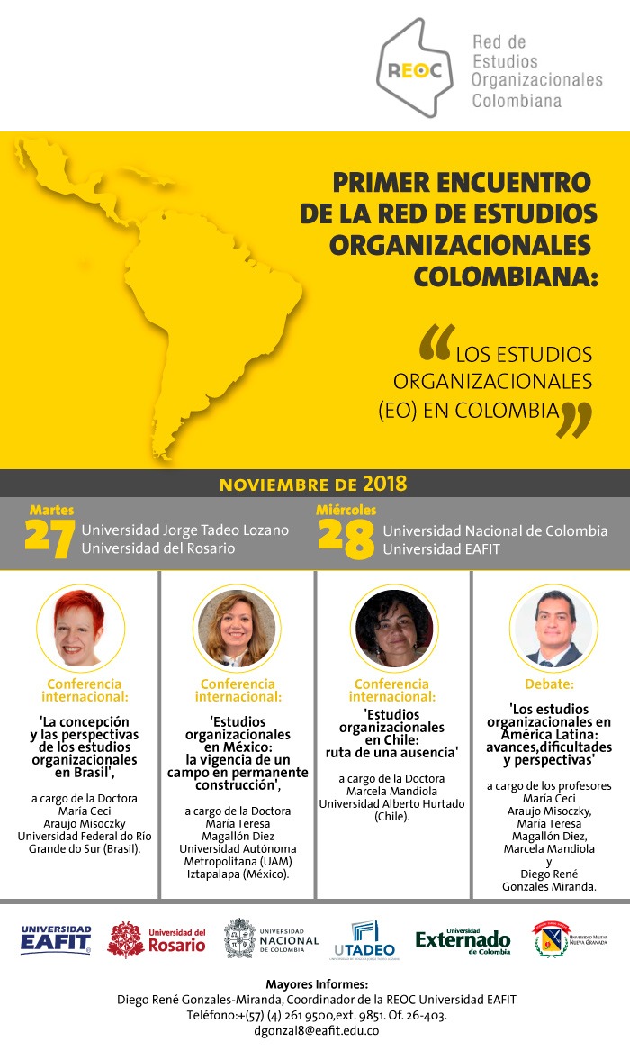 Este evento se trabajará de manera conjunta con EAFIT, la Universidad del Rosario y la Universidad Nacional y contará con el apoyo de CPAE. Adicionalmente, este evento hará parte de la agenda que estarán manejando las otras universidades en el marco del Primero Encuentro de laRed de Estudios Organizacionales Colombiana.