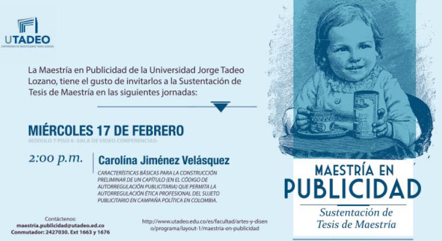 La Maestría en Publicidad de la Universidad Jorge Tadeo Lozano, tiene el gusto de invitarlos a la Sustentación de Tesis de Maestría a cargo de Carolina Jiménez Velásquez.