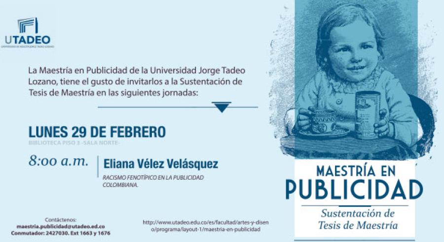 La Maestría en Publicidad de la Universidad Jorge Tadeo Lozano, tiene el gusto de invitarlos a la Sustentación de Tesis de Maestría a cargo de Eliana Vélez Velásquez. "Racismo Fenotípico en la Publicidad Colombiana".