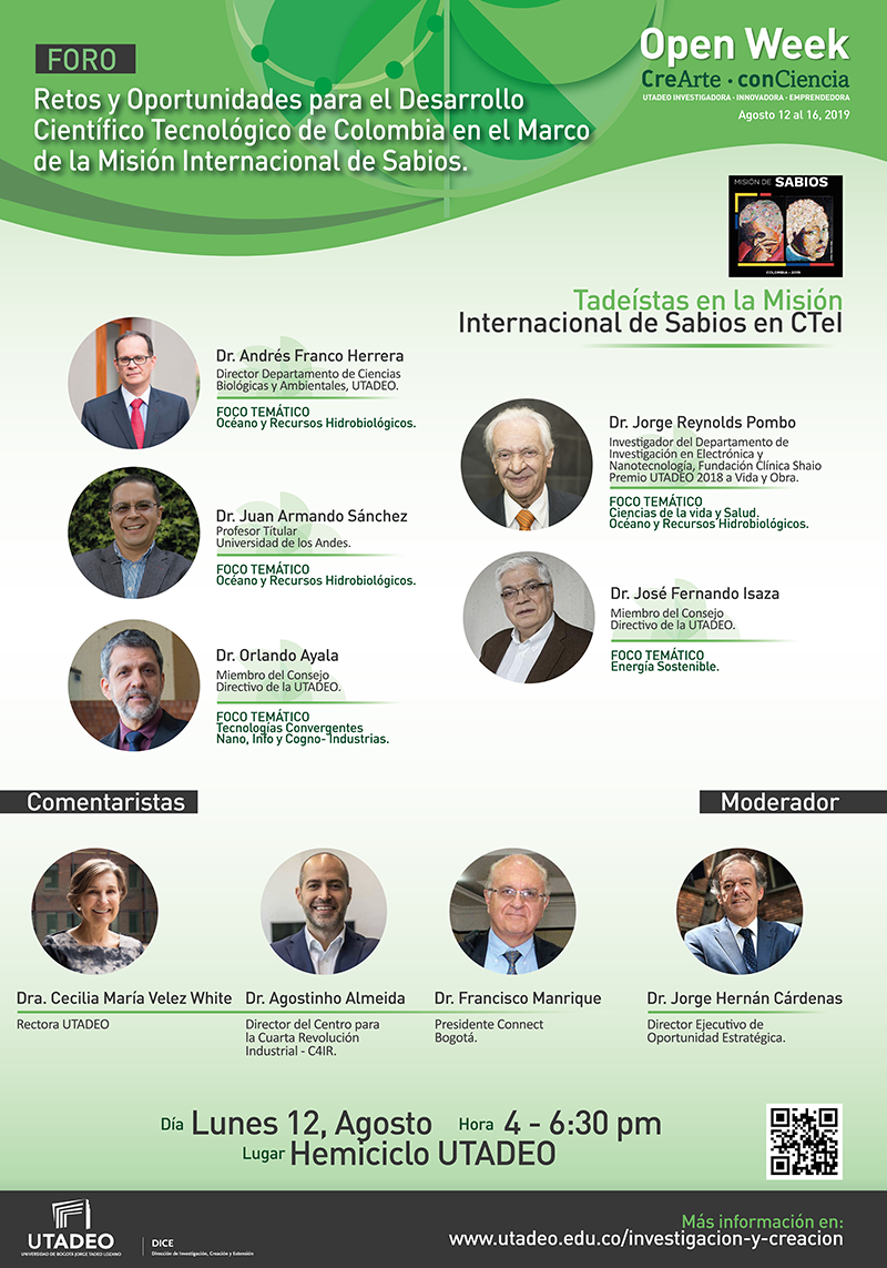Con el fin de fijar la hoja de ruta que guiará las políticas públicas de Colombia en materia de Ciencia, Tecnología e Innovación para los próximos 25 años, el Gobierno nacional convocó, este año, a un grupo de 43 expertos nacionales e internacionales en ocho focos temáticos, que son de interés prioritario para nuestro país, en la denominada Misión Internacional de Sabios. Utadeo es una de las siete universidades ancla de esta Misión, en el foco temático de Océanos y Recursos Hidrobiológicos, gracias a su liderazgo en los temas marinos y costeros durante más de seis décadas.