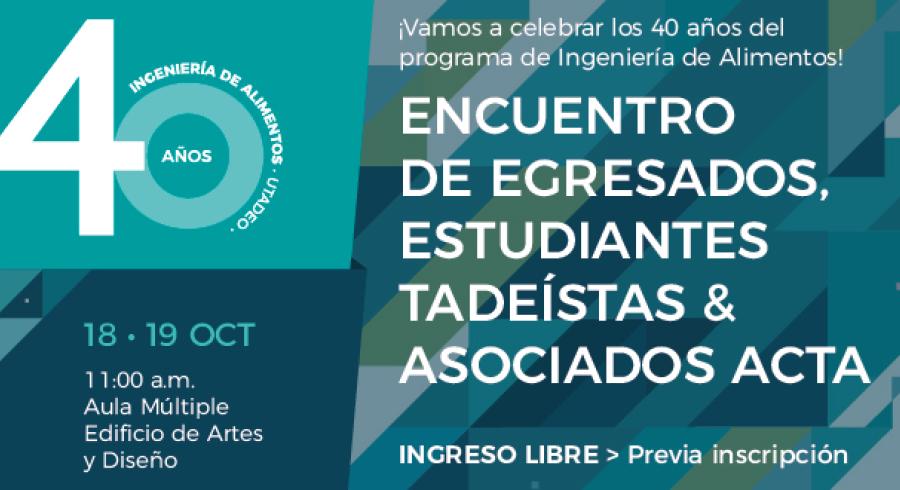 Como parte del segundo día de la celebración de los 40 años del programa de Ingeniería de Alimentos de Utadeo, la Asociación Colombiana de Tecnología de Alimentos (ACTA) realizará en nuestra Universidad su Encuentro Distrital de Estudiantes y Egresados Asociados. El evento se llevará a cabo el 19 de octubre, a partir de las 2:30 p.m., en el Aula Máxima del Edificio de Artes y Diseño (Módulo 20).